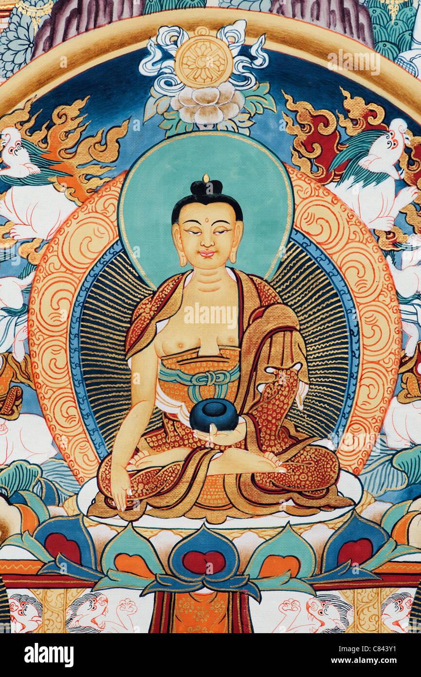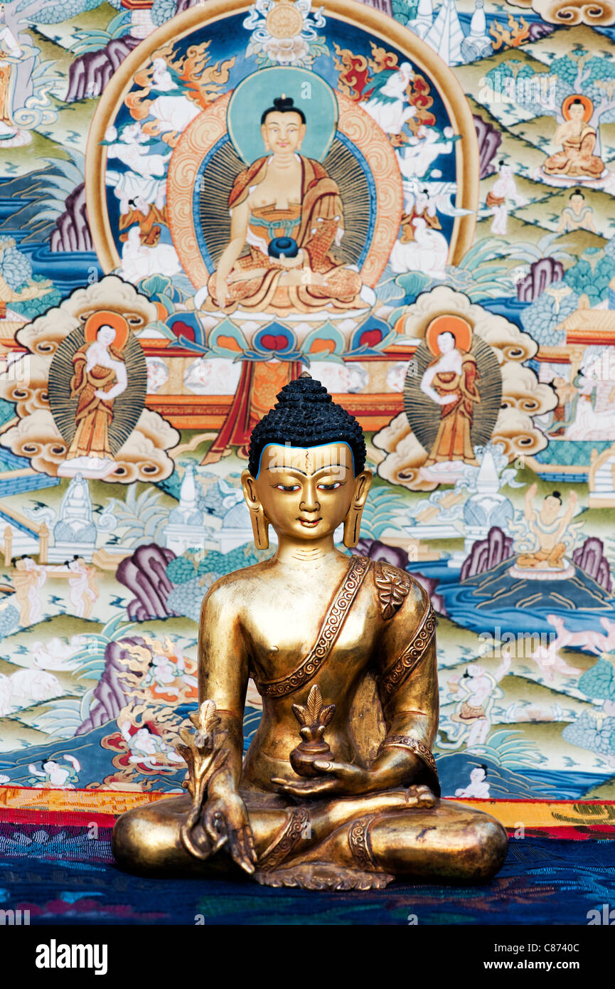 Estatua De Buda En Frente De Un Budista Tibetano Thangka Tanka Pintura Fotografia De Stock Alamy