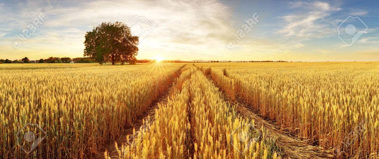 Oro Trigo Flied Panorama Con El Arbol Al Atardecer Campo Rural Fotos Retratos Imagenes Y Fotografia De Archivo Libres De Derecho Image 81857006