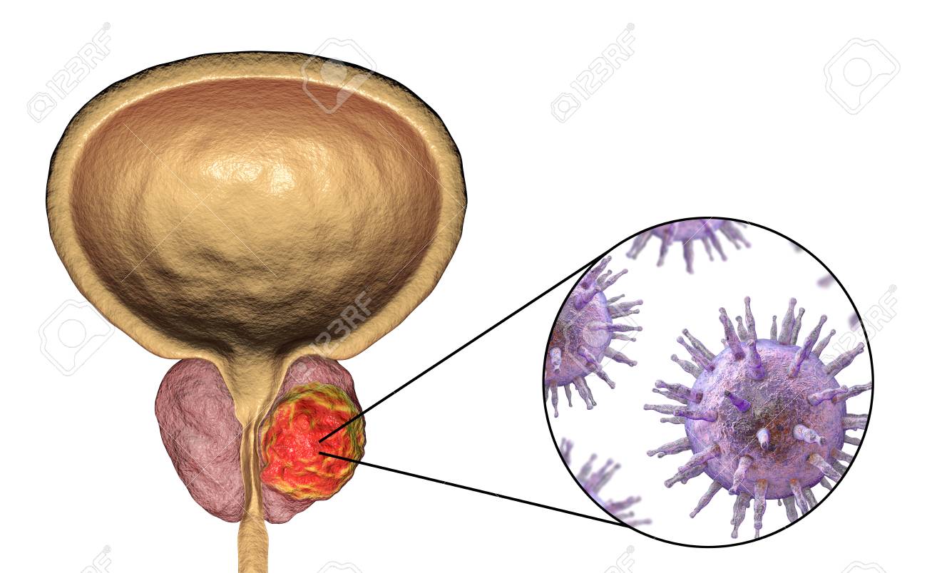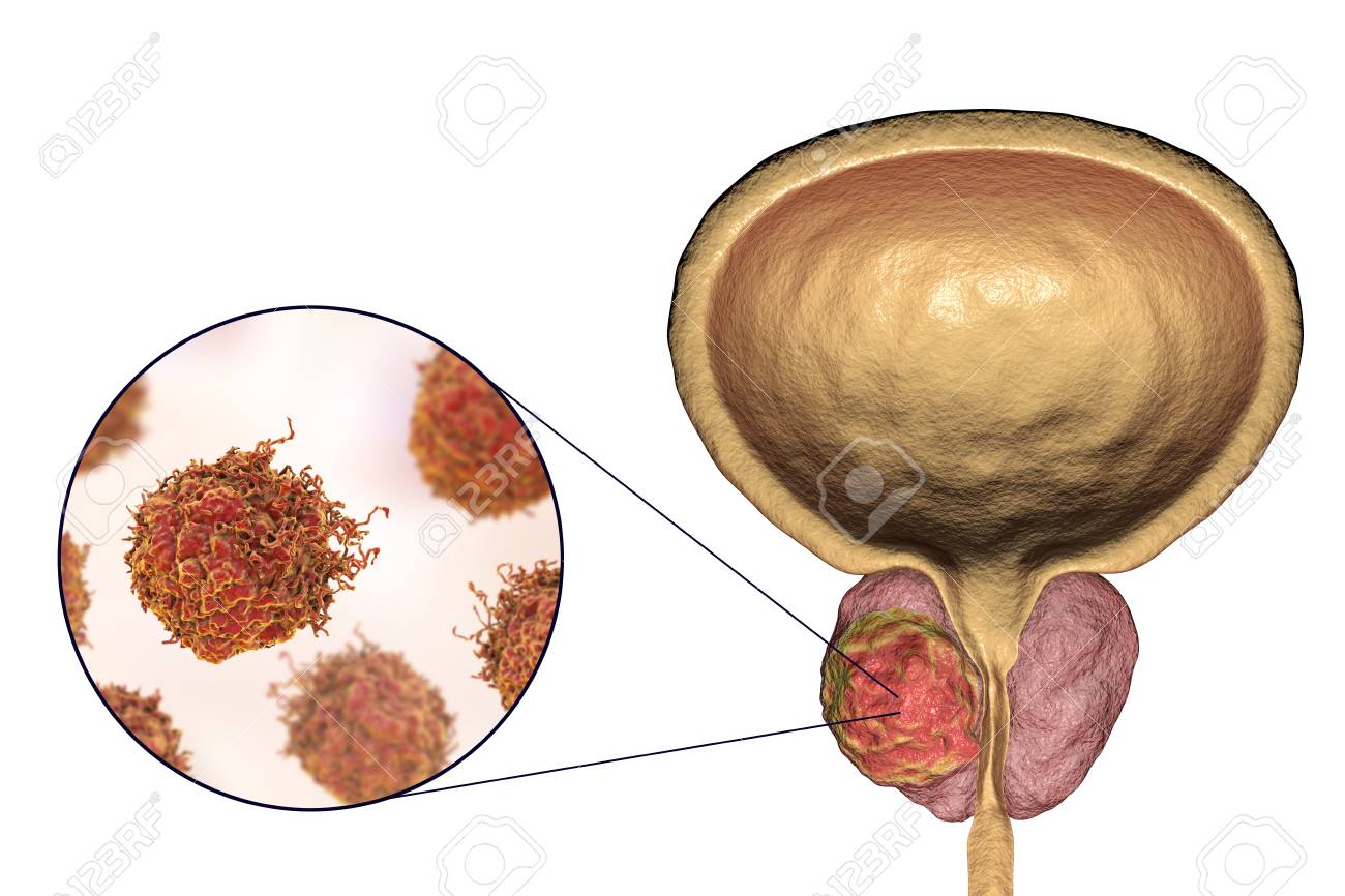 Cancer De Prostata Ilustracion 3d Que Muestra El Tumor Dentro De La Glandula De La Prostata Y La Vista De Cerca De Las Celulas Cancerosas Fotos Retratos Imagenes Y Fotografia De Archivo