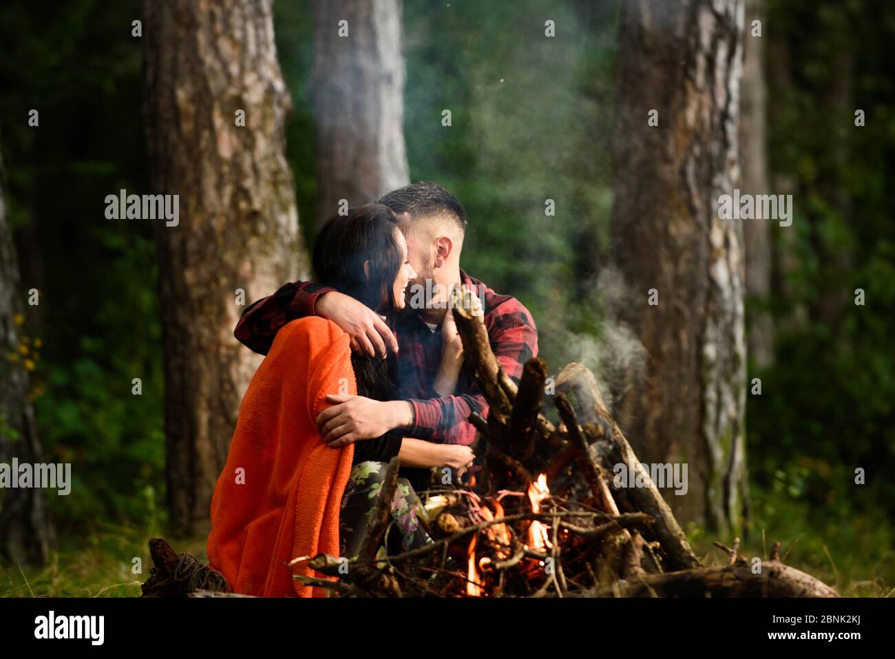 El Hombre Con Mujer Se Abraza Y Besa Cerca De La Hoguera Pareja Joven Con Caras
