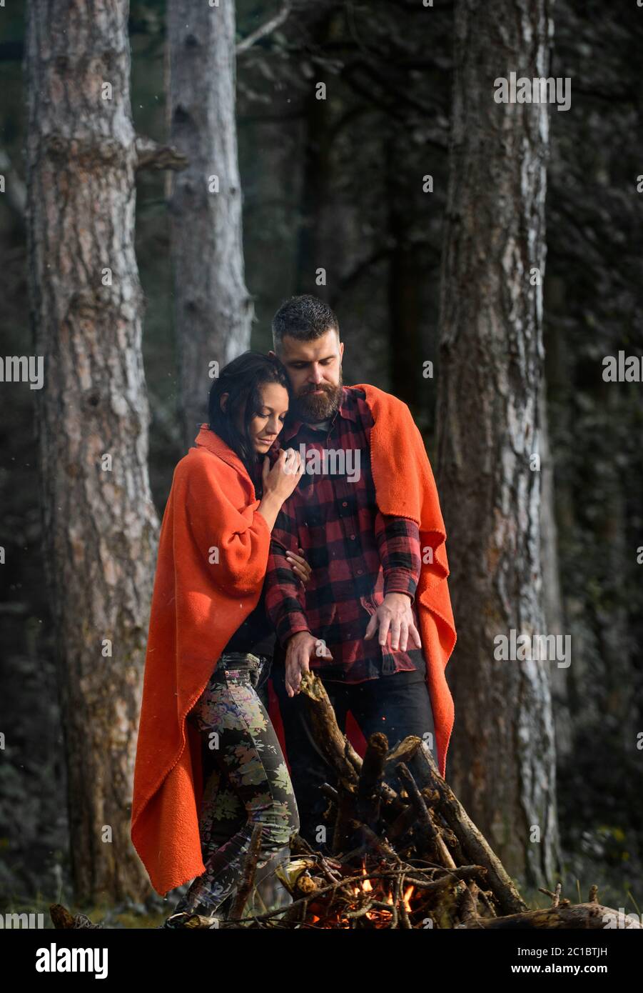 El Hombre Con Mujer Abraza Y Se Calienta Cerca De La Hoguera Pareja Joven Con Caras