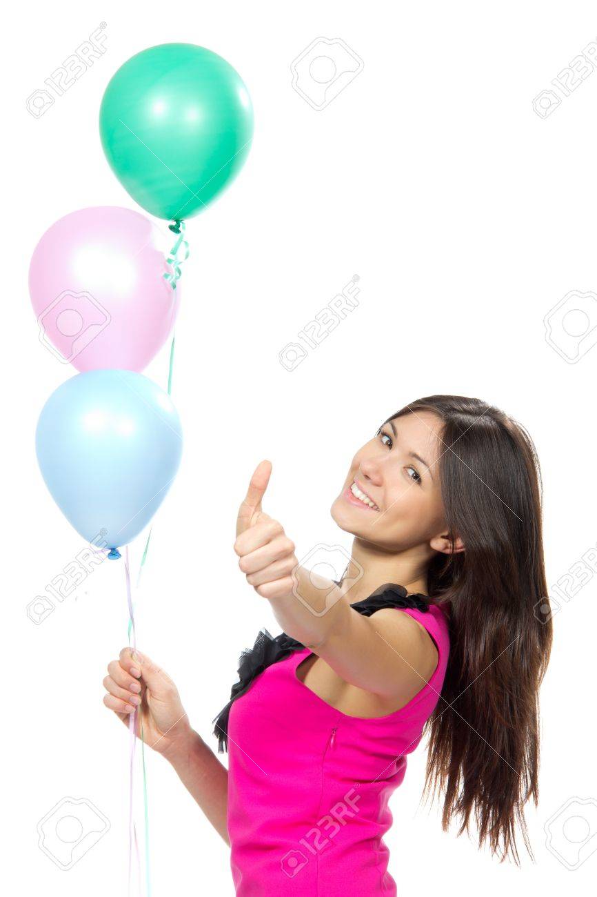 Mujer Joven Feliz Con Globos Para La Fiesta De Cumpleanos Presenta Sonriente Y Mostrando El Pulgar Hacia Arriba Sobre Un Fondo Blanco Fotos Retratos Imagenes Y Fotografia De Archivo Libres De Derecho