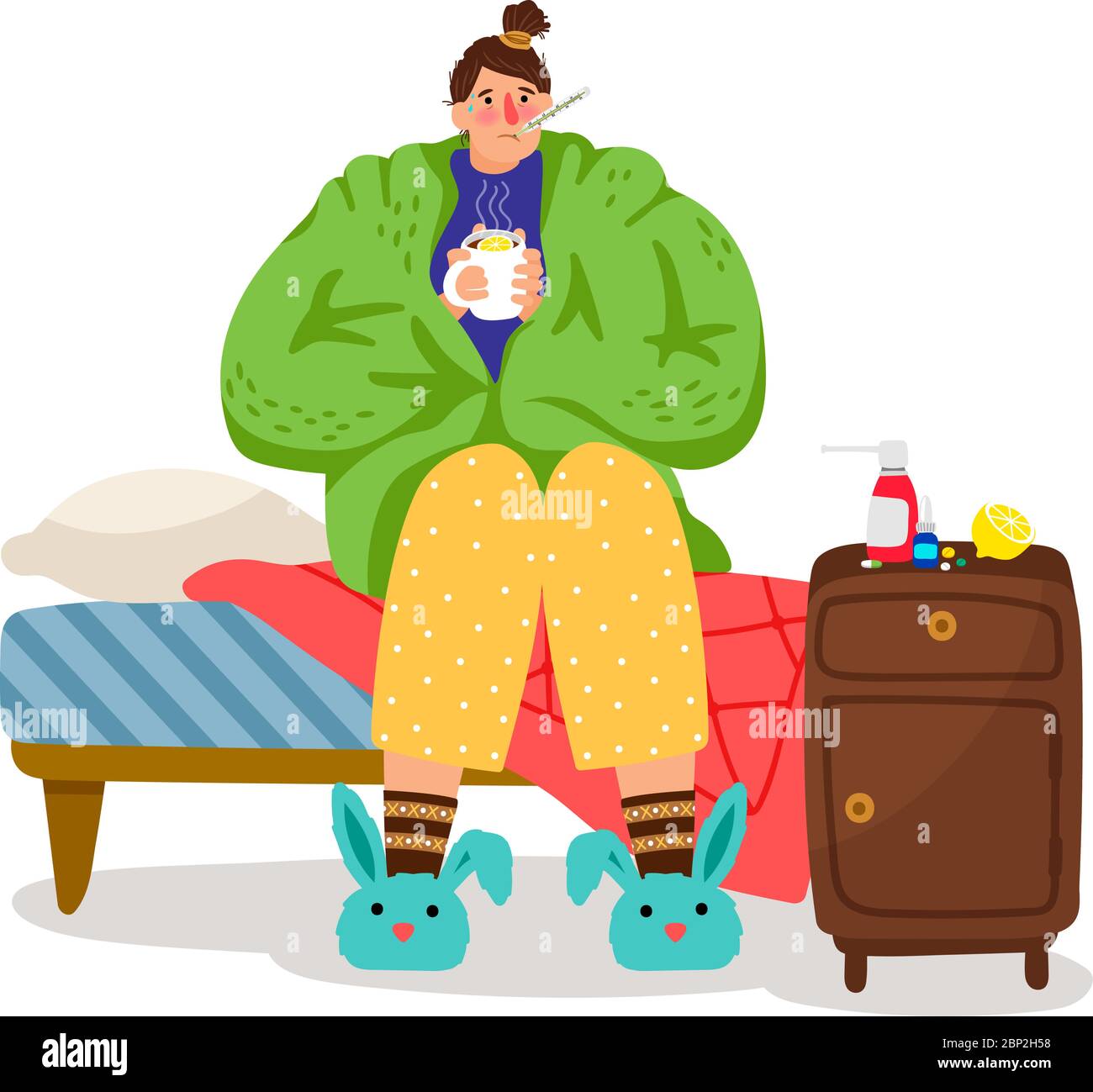 Mujer De Gripe Caricatura Nina Enferma Con Fiebre Y Temperatura De Calor Dolor De Cabeza Y Medicamentos Invierno Frio Enfermedad Caracter Vector Imagen Vector De Stock Alamy