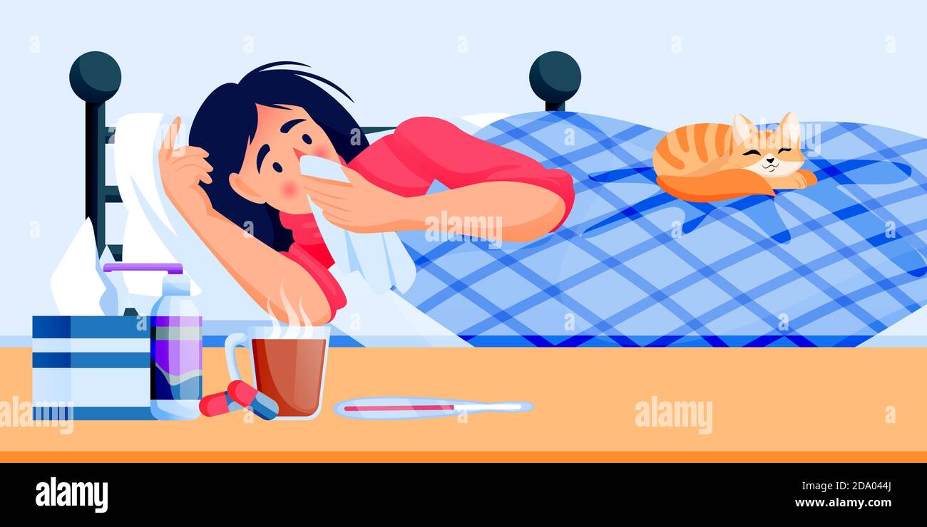 Cartoon Mujer Enferma Mujer Enferma Con Resfriado Y Gripe Nina Con Enfermedad Por Calor Medicamentos Y Dolor De Cabeza Vector Ilustracion Imagen Vector De Stock Alamy