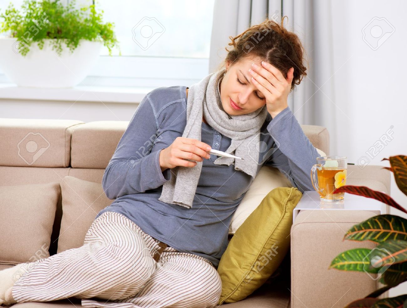 Mujer Enferma Con La Gripe Dolor De Cabeza Termometro Fotos Retratos Imagenes Y Fotografia De Archivo Libres De Derecho Image 16311386