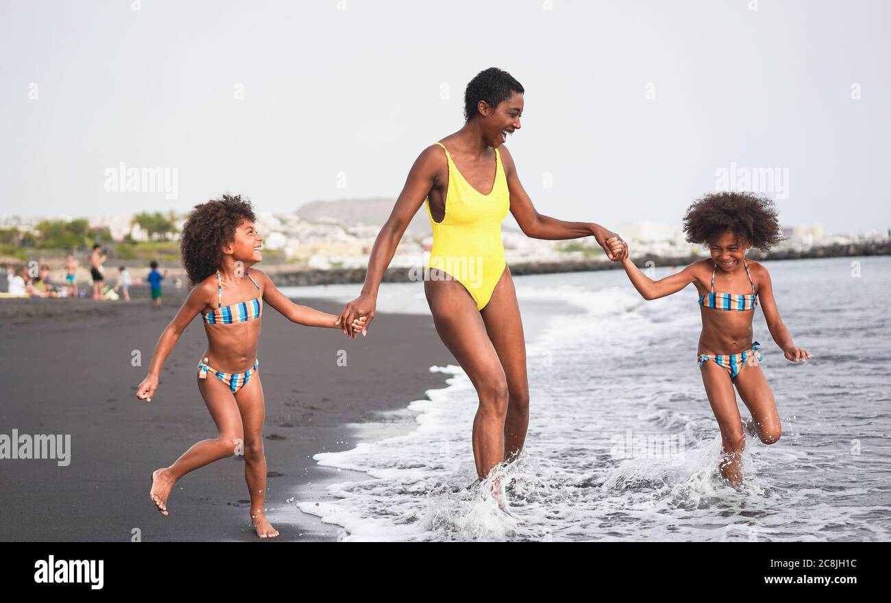 Hermanas Africanas Gemelos Corriendo En La Playa Con Madre Sonriente Familias Negras Pasandose Bien En Verano Vacaciones Viajes Y Felicidad Mas Fotografia De Stock Alamy