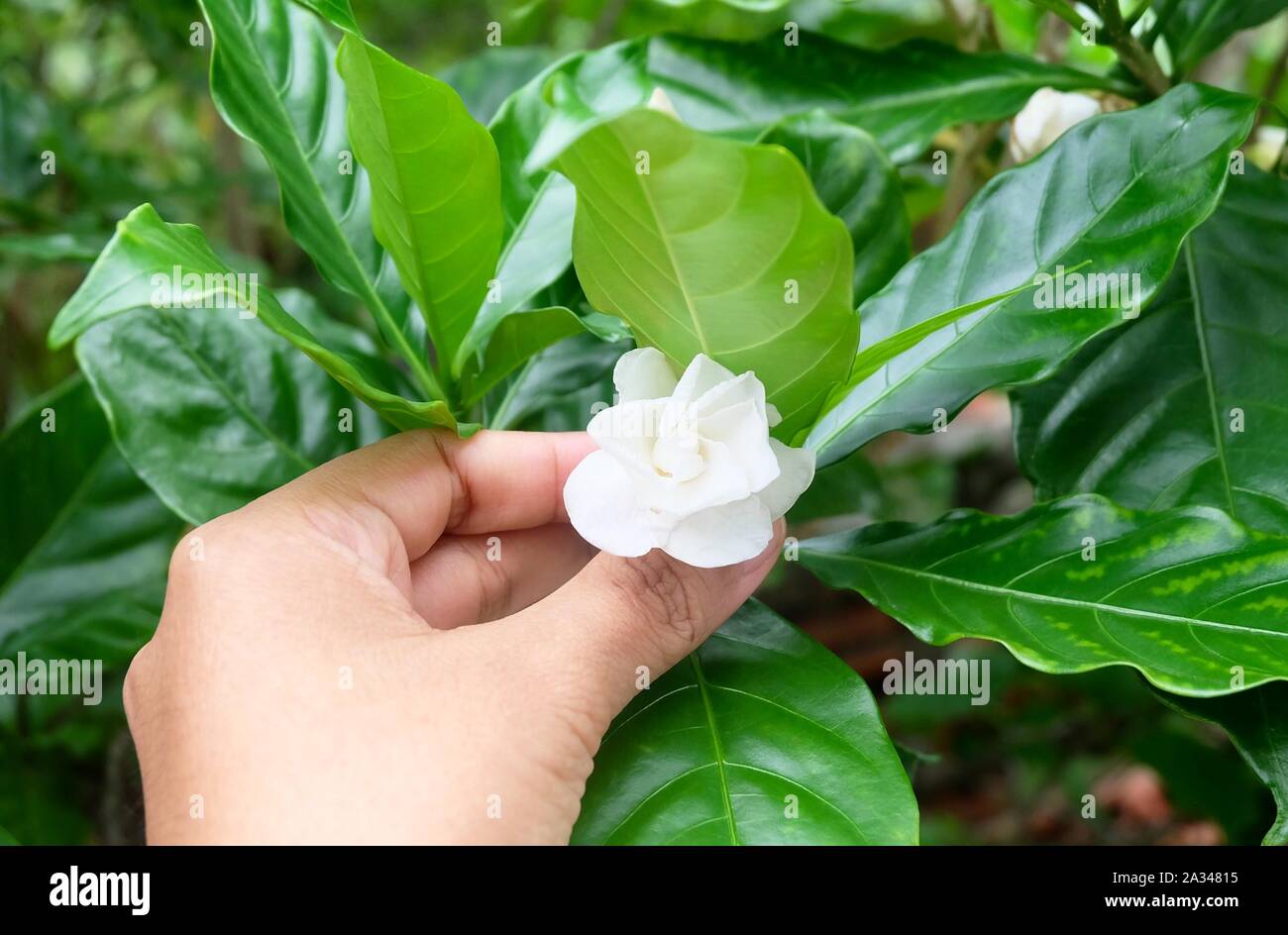 Hermosa Flor Mano Sosteniendo Precioso Blanco Comun De Gardenias O Flores De Jazmin Del Cabo De Cuidar El Jardin Fotografia De Stock Alamy