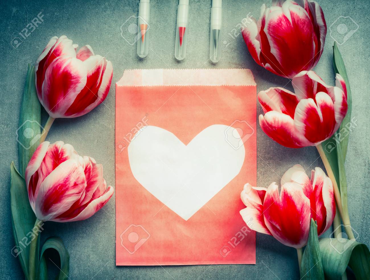 Sobre De Papel Con El Corazon Flores Preciosas Frescas De Los Tulipanes Y Marcadores Del Cepillo Vision Superior Espacio De La Copia Resumen Amor Y Concepto De Saludo Fotos Retratos Imagenes Y