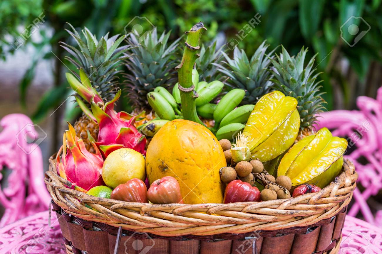 Una Gran Variedad De Frutas Exoticas En Una Cesta Sobre Fondo Verde Fotos Retratos Imagenes Y Fotografia De Archivo Libres De Derecho Image 37419855