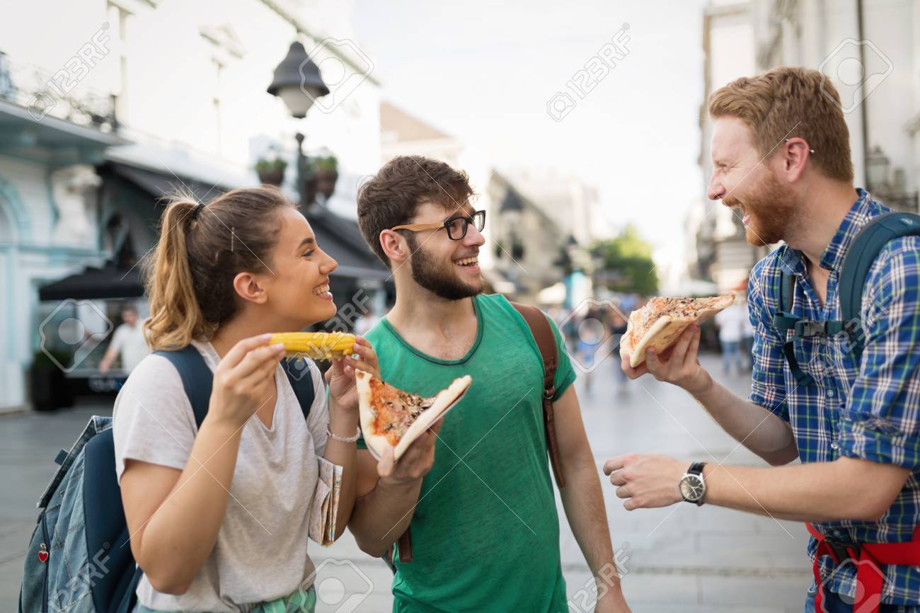Gente Feliz Comiendo Comida Rapida En La Ciudad Mientras Viajaba Con Mochilas Fotos Retratos Imagenes Y Fotografia De Archivo Libres De Derecho Image 71328466