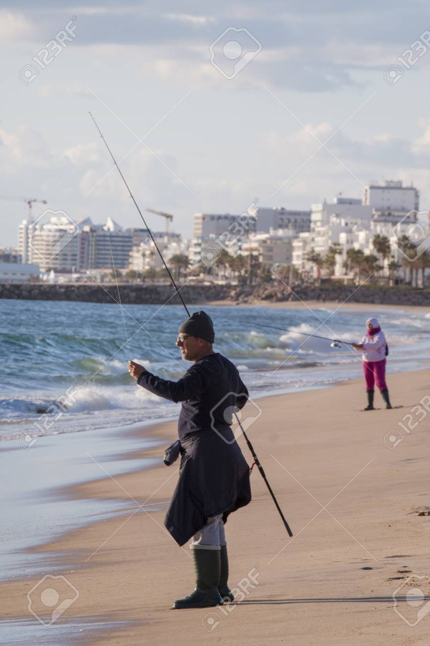 Quarteira Portugal 4 De Febrero De 2018 Gente Pescando Con Una Cana De Pescar Desde La Orilla De La Playa Hasta El Mar Fotos Retratos Imagenes Y Fotografia De Archivo