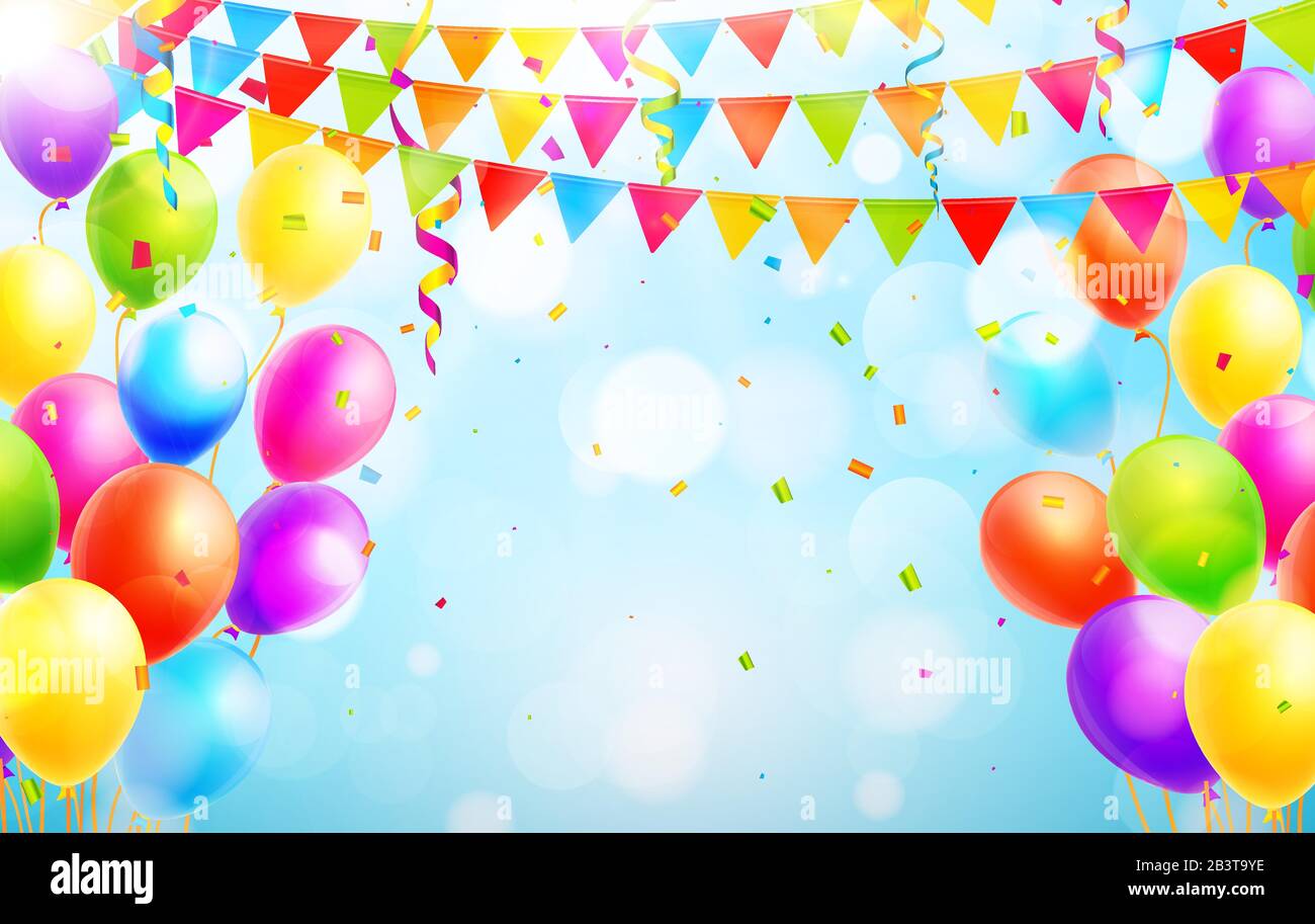 Globos Coloridos Y Banderas De Fiesta Sobre Fondo Azul Con Hierba Verde Y Bokeh Ilustracion Vectorial Imagen Vector De Stock Alamy
