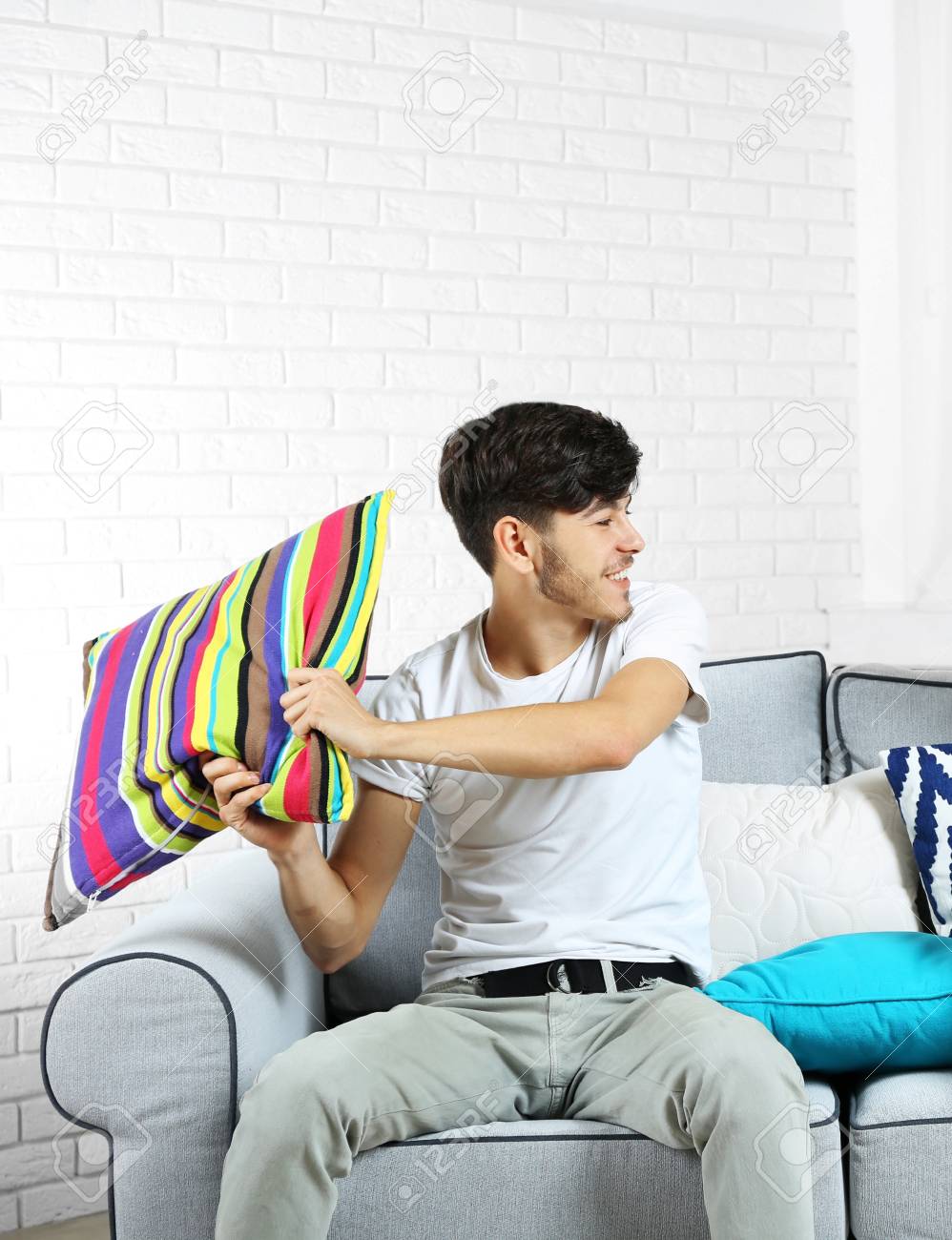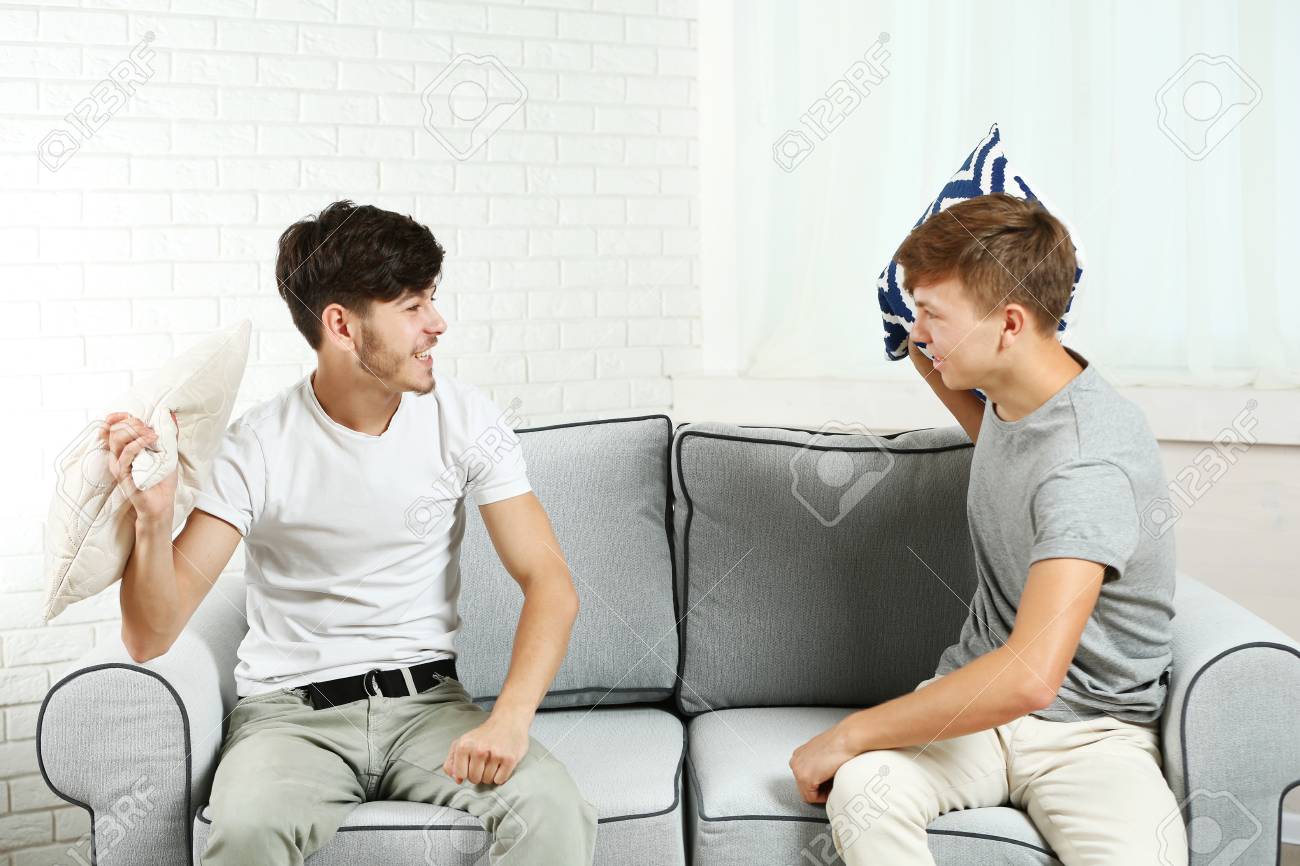 Dos Hermanos Peleando Con Almohadas En El Sofa En Casa Fotos Retratos Imagenes Y Fotografia De Archivo Libres De Derecho Image 95609098