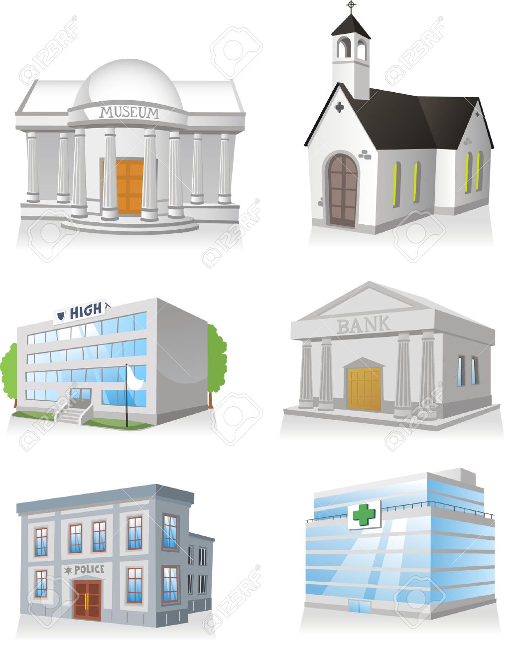 Edificio De Dibujos Animados Publica Establece 3 Iglesia Hospital Estacion De Policia Museo Escuela Secundaria Banco Ilustraciones Vectoriales Clip Art Vectorizado Libre De Derechos Image 33743357