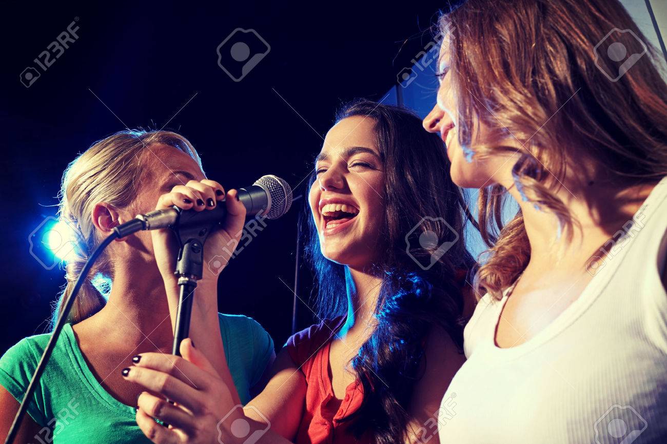 Mujeres Jovenes Felices Cantando Karaoke En Club Nocturno Fotos Retratos Imagenes Y Fotografia De Archivo Libres De Derecho Image 54657093