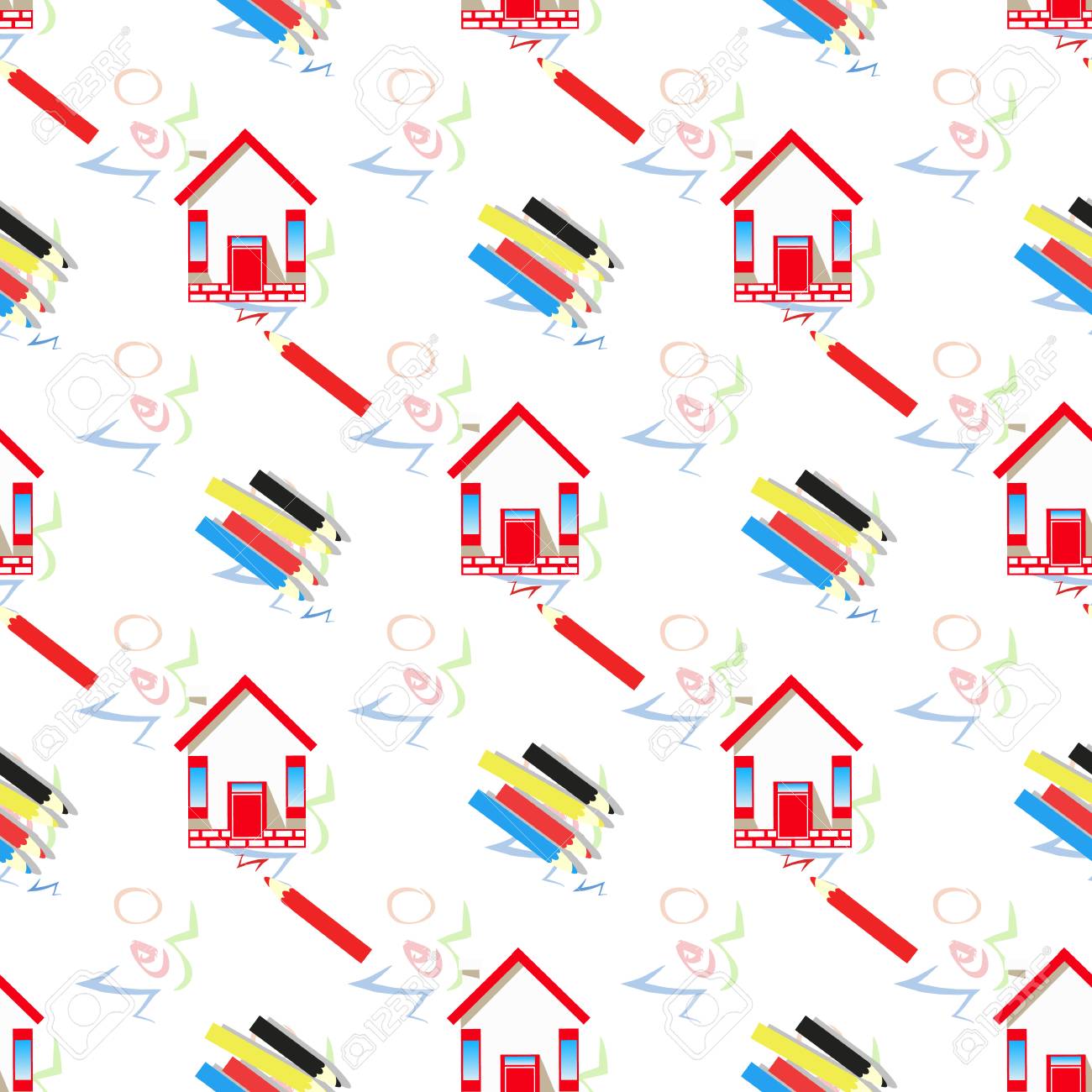 Lapices Y Hogar Patron Sin Costuras Ilustracion De Los Ninos S Se Utiliza Para Imprimir Sitios Web Telefonos Inteligentes Diseno Textiles Telas De Ceramica Impresiones Postales Empaques Etc Ilustraciones Vectoriales Clip Art