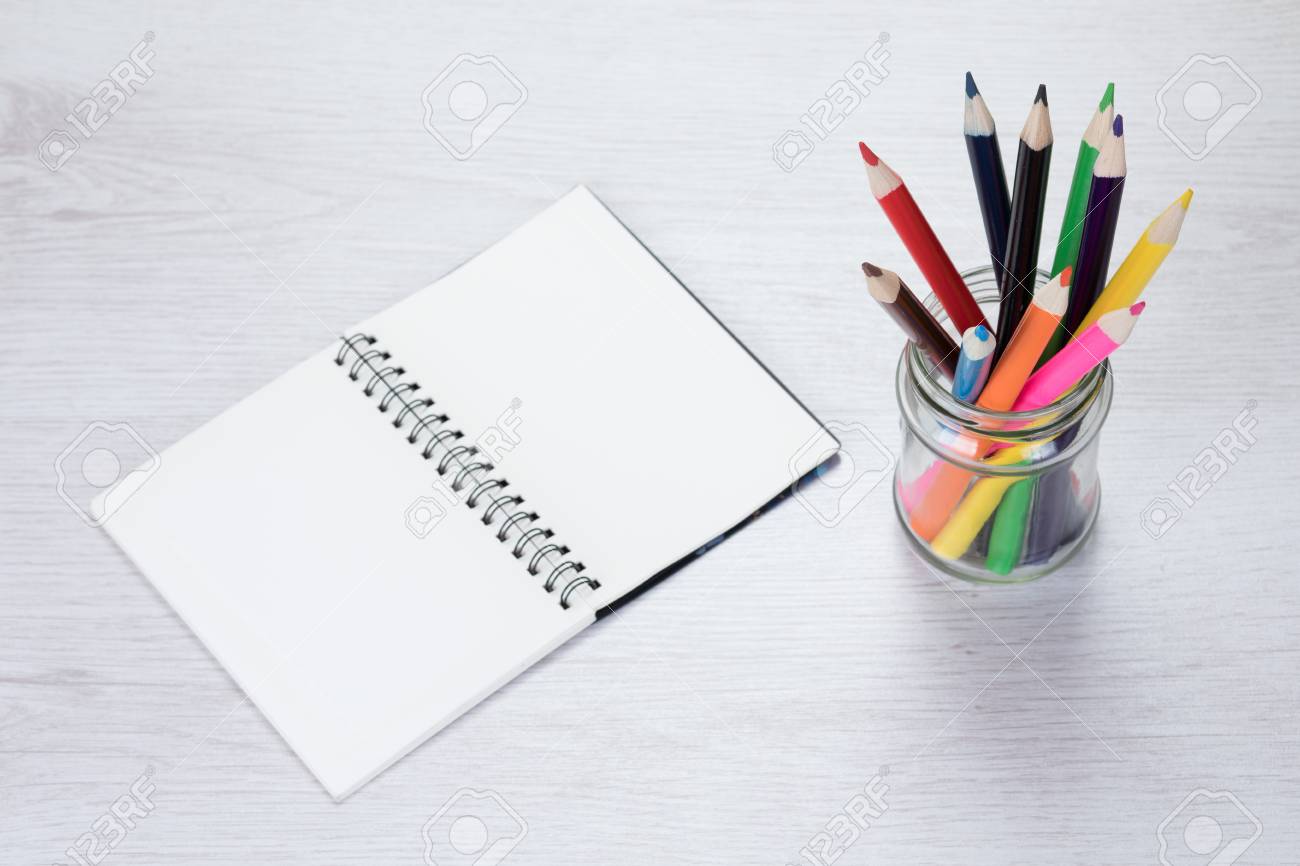Abra O Caderno Ao Lado De Lapis De Cor Lapis De Cor Permanente Em Um Frasco De Vidro Sobre Um Fundo De Madeira Texturizado Branco Com Espaco De Copia Fotos Retratos Imagenes