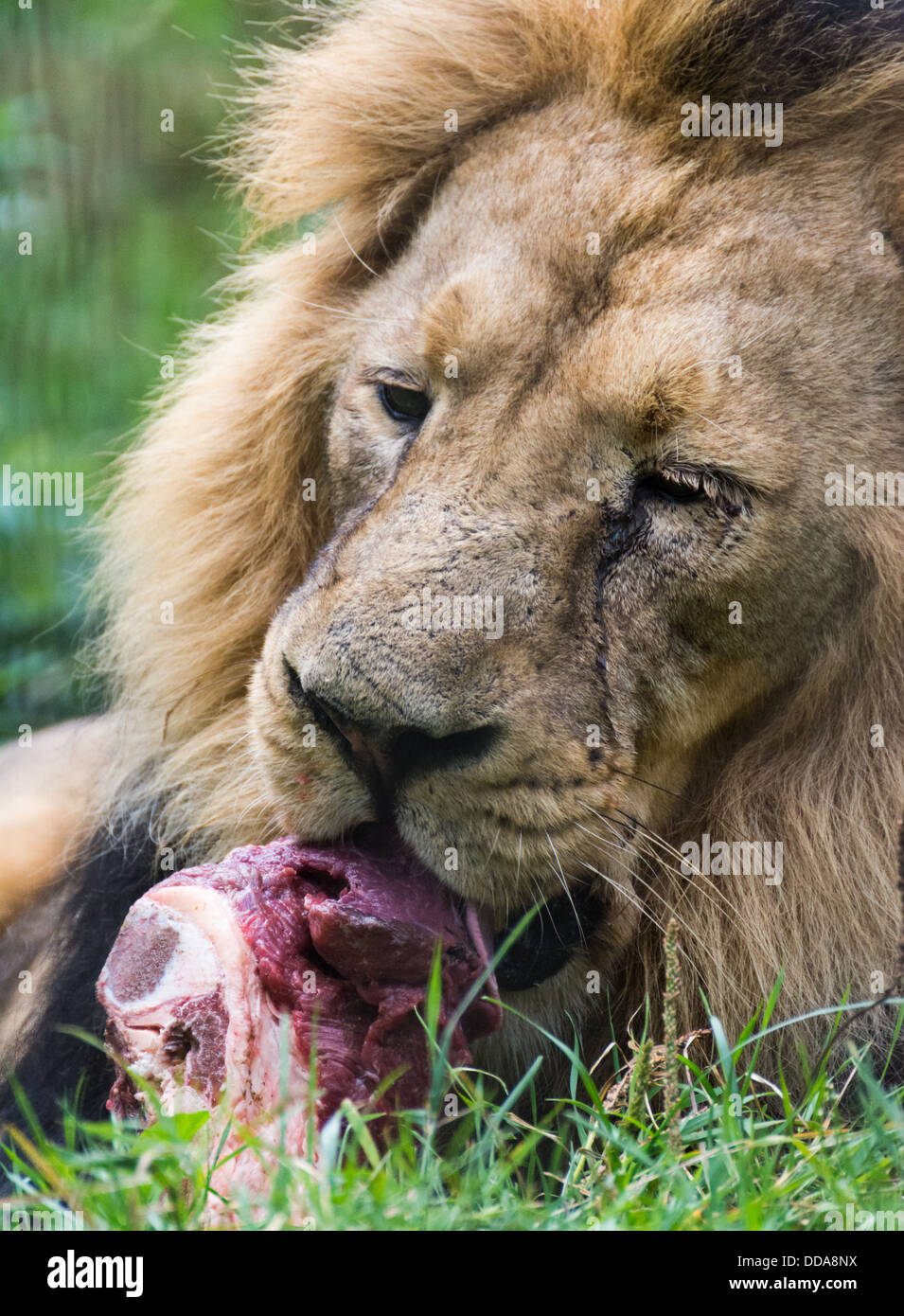 Closeup Retrato De Un Leon Comiendo Un Pedazo De Carne Fotografia De Stock Alamy