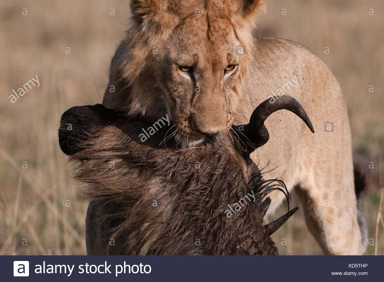 Leon Joven Comiendo Un Nu Masai Mara Kenya Fotografia De Stock Alamy