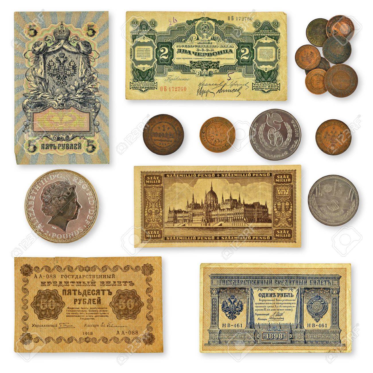 Coleccion De Billetes Y Monedas Antiguas Aisladas Sobre Fondo Blanco Fotos Retratos Imagenes Y Fotografia De Archivo Libres De Derecho Image 19442898