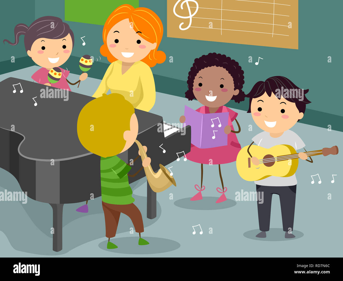 Ilustracion De Stickman Con Maestros De Ninos Tocando Instrumentos Musicales En La Sala De Musica Fotografia De Stock Alamy