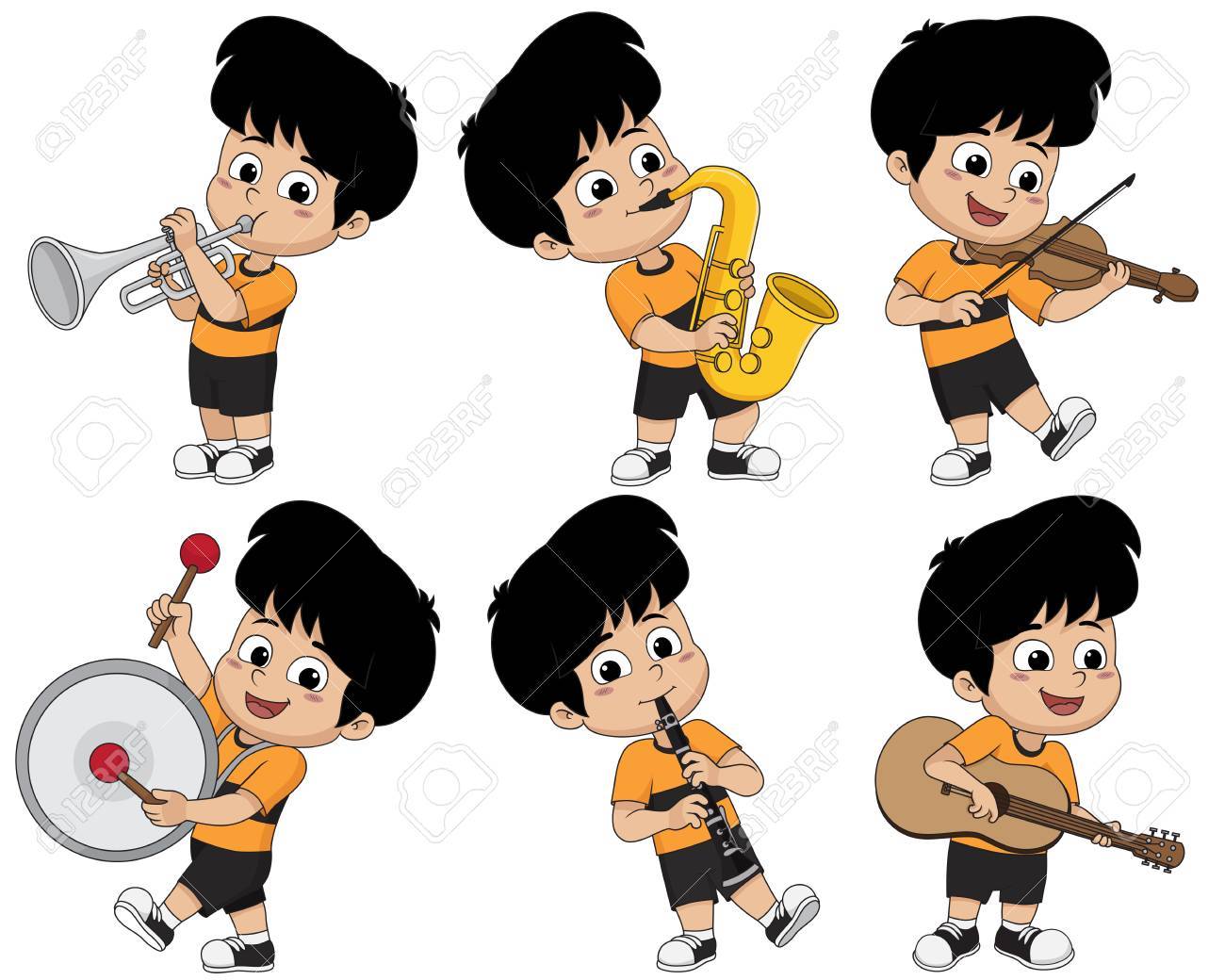 Nino Tocando Instrumentos Musicales Como Trompeta Saxofon Violin Tambor Clarinete Y Guitarra Vector E Ilustracion Ilustraciones Vectoriales Clip Art Vectorizado Libre De Derechos Image 89701597