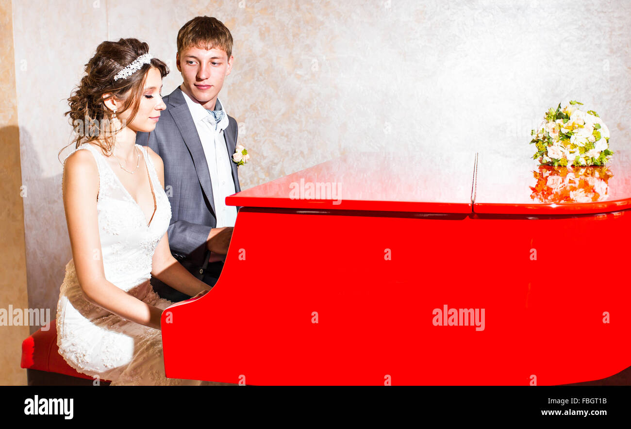 Encantadora Pareja De Novios Jugando En Un Piano Rojo En La Habitacion Fotografia De Stock Alamy