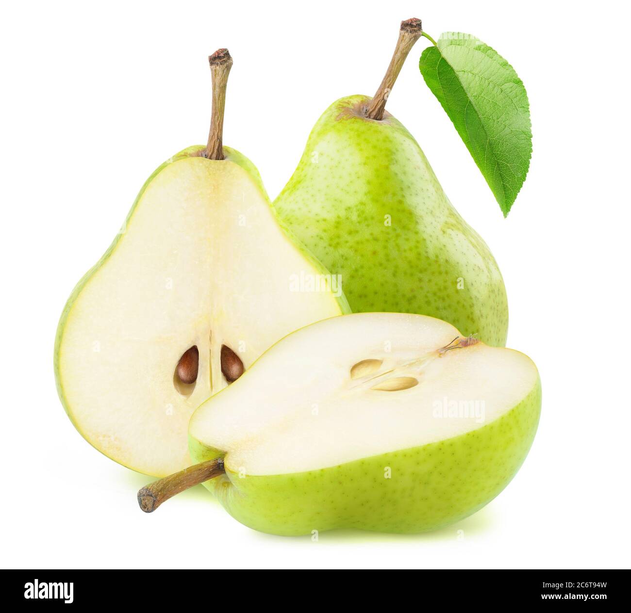 Peras Verdes Aisladas Una Fruta De Pera Entera Y Una Cortada En Mitades Aisladas Sobre Fondo Blanco Fotografia De Stock Alamy
