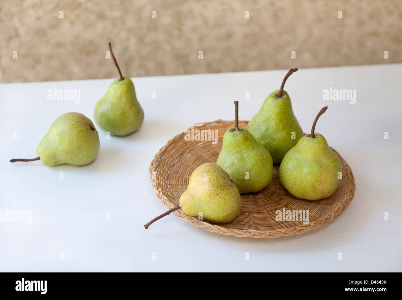 Seis Peras Verdes En Un Plato De Junco Tejido Fijado En Un Tablero Blanco Con Un Fondo Con Trama Fotografia De Stock Alamy
