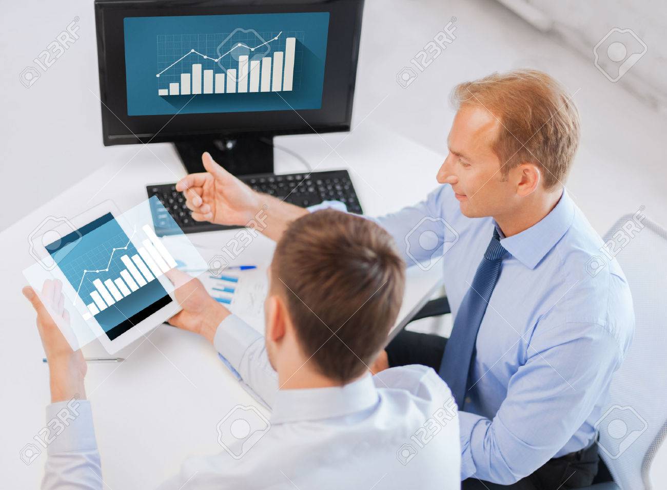 Negocios Tecnologia Estadisticas Economia Y Concepto De Las Personas Hombres De Negocios Con Graficos De Pc De La Tableta Y El Ordenador En La Oficina Fotos Retratos Imagenes Y Fotografia De