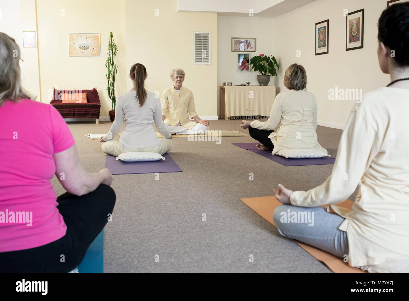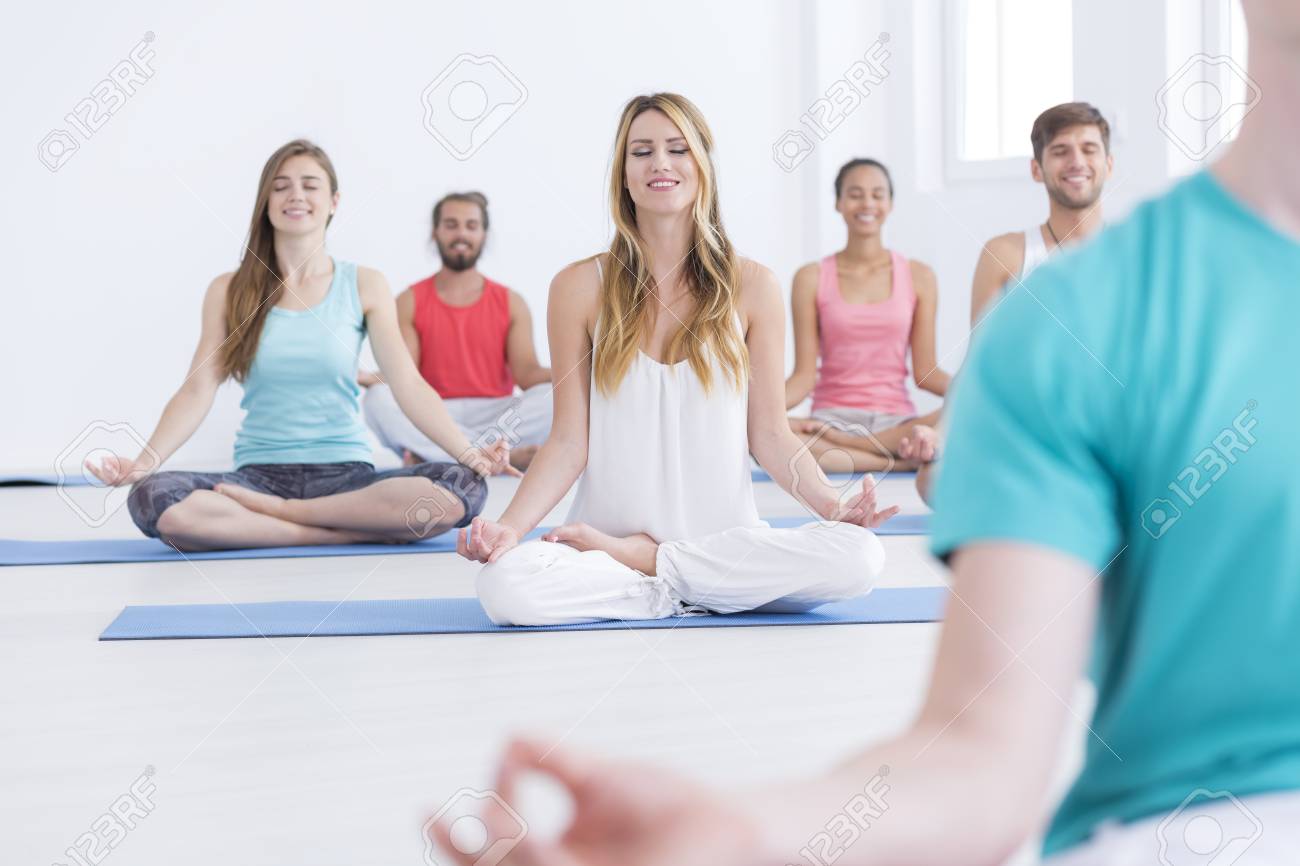 Personas Meditando En La Clase De Yoga Durante Un Ejercicio De Respiracion Fotos Retratos Imagenes Y Fotografia De Archivo Libres De Derecho Image 65285950
