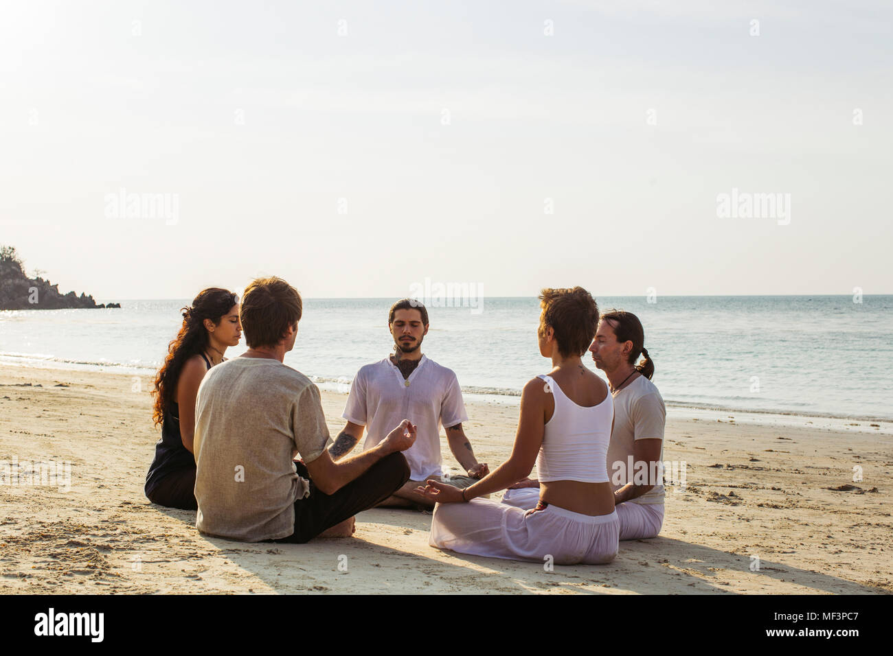 Serena En El Circulo De Personas Meditando En Sunny Beach Durante Yoga Retreat Fotografia De Stock Alamy