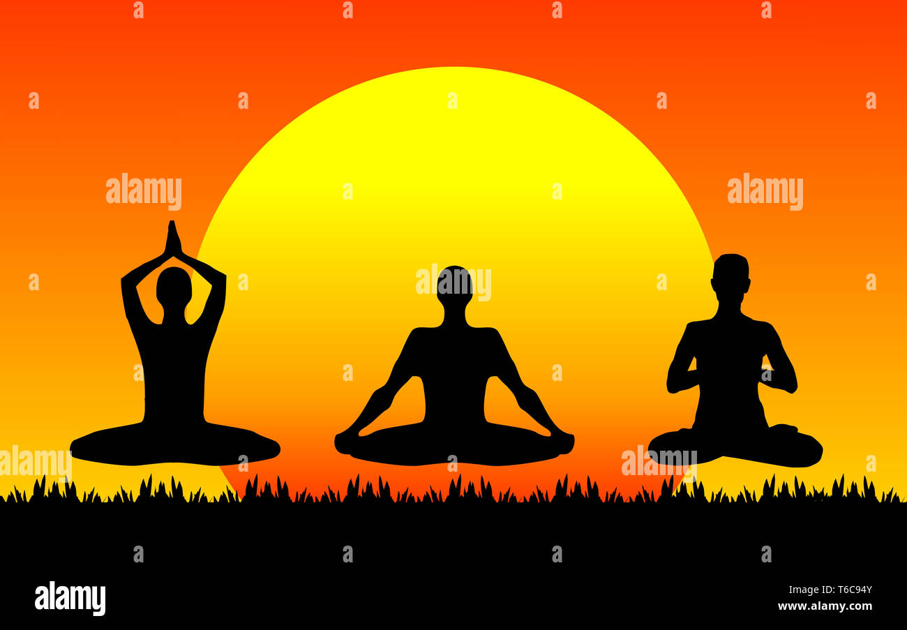Tres Personas Meditando Con El Sol En El Fondo Fotografia De Stock Alamy