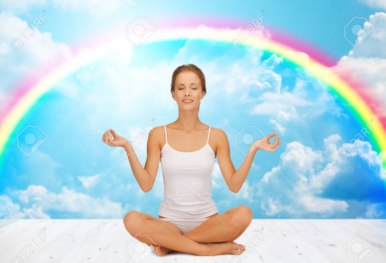 Concepto De Personas Salud Bienestar Y Meditacion Mujer En Ropa Interior Meditando En Posicion De Loto De Yoga En El Piso De Madera Sobre Nubes Blancas Y Arco Iris En El