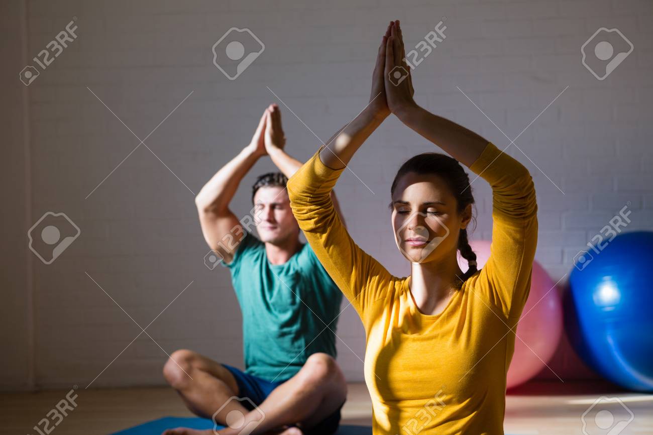 Personas Meditando En Posicion De Oracion En El Club De Salud Fotos Retratos Imagenes Y Fotografia De Archivo Libres De Derecho Image 87761807