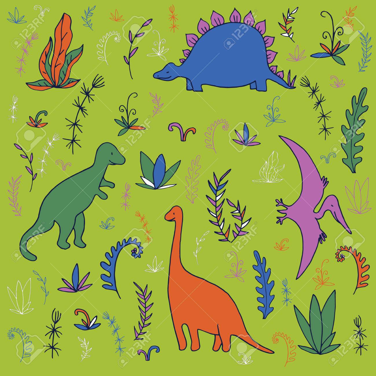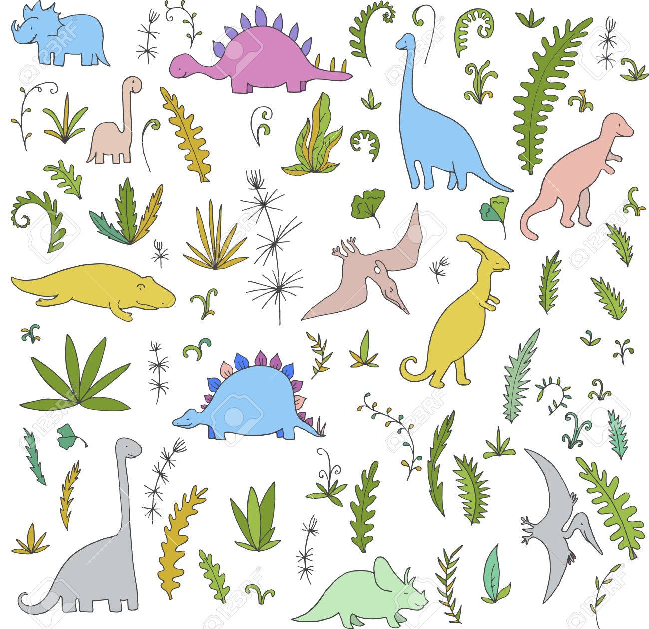 Vector Conjunto De Dinosaurios Y Plantas Prehistoricas Fondo De Vector Dibujado A Mano Ilustraciones Vectoriales Clip Art Vectorizado Libre De Derechos Image 54024806