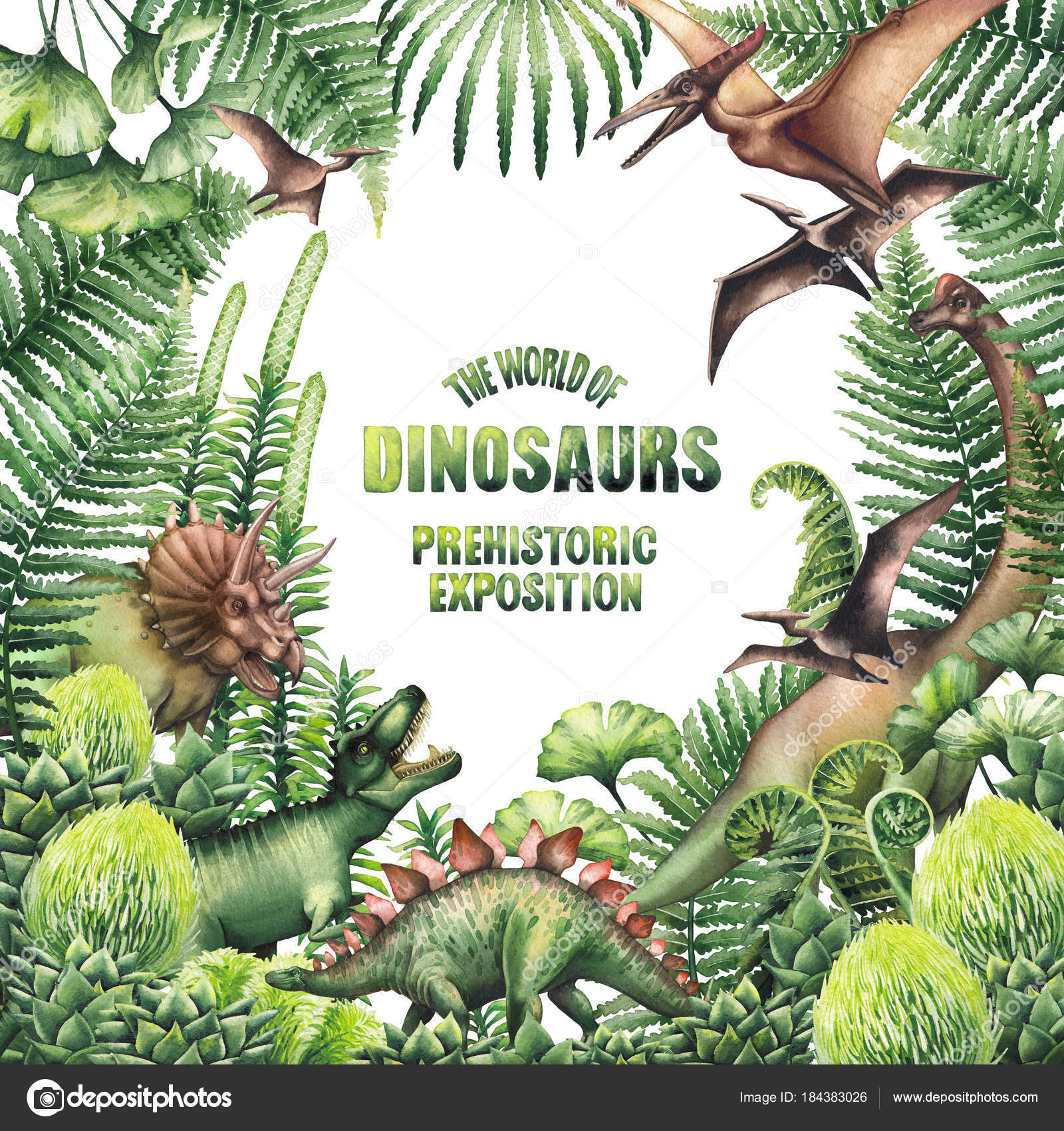 Imagen De Grupo De Dinosaurios Con Plantas Prehistoricas Ilustracion De Dibujado A Mano Acuarela Aislado Sobre Fondo Blanco Fotografia De Stock
