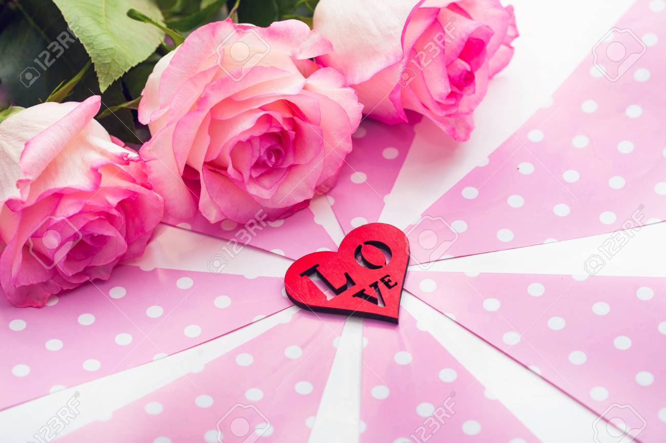 Tres Rosas Bonitas E Figura De Madeira Vermelha Do Coracao No Fundo Cor De Rosa E Branco Dia De Sao Valentim Fotos Retratos Imagenes Y Fotografia De Archivo Libres De Derecho Image 69977097