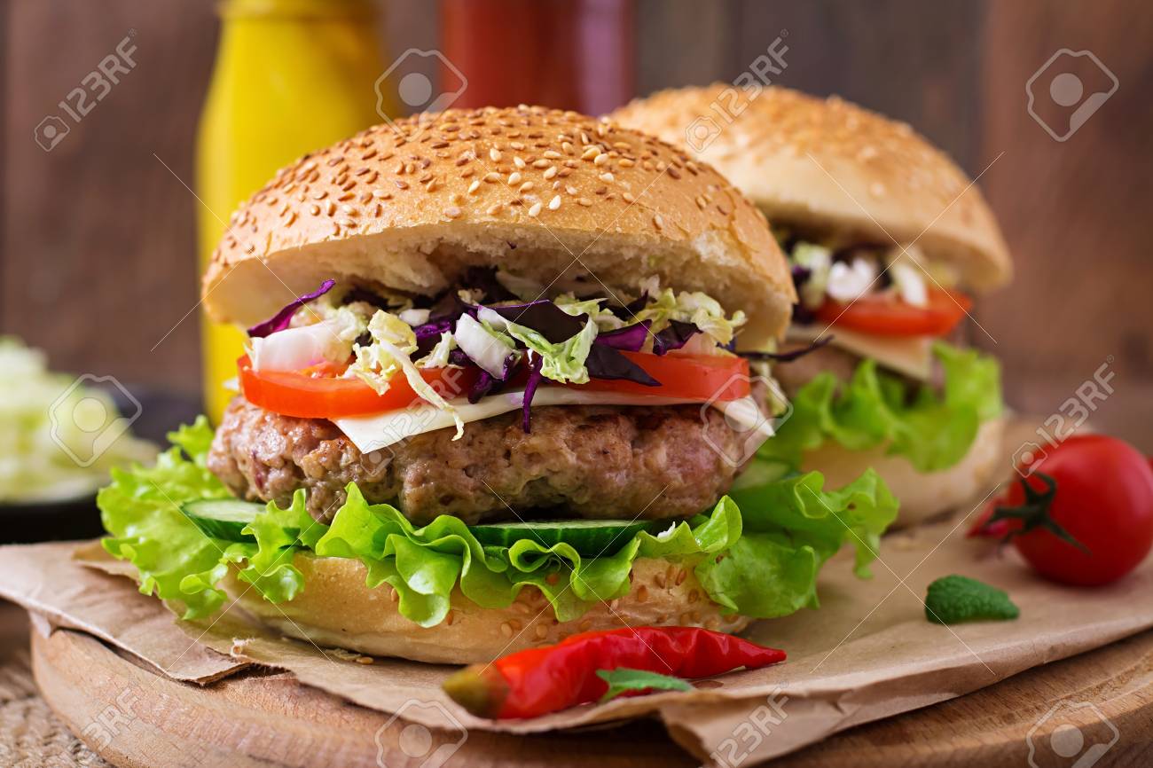 Sandwich Hamburger With Juicy Burgers Cheese And Mix Of Cabbage Stock Photo Picture And Royalty Free Image Image 49938477