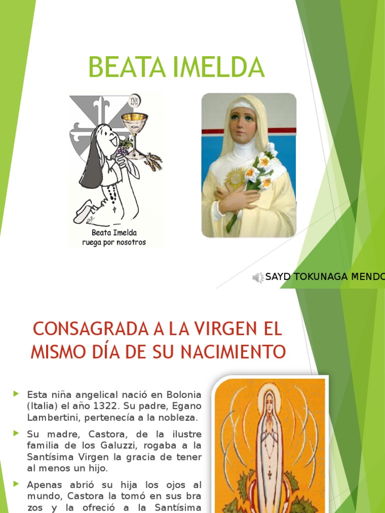Imágenes de feliz cumpleaños imelda en nuestras imágenes de feliz cumpleaños imelda podrás colocar todos los grandes deseos que tengas y hacérselo llegar mediante su plataforma preferida. Devota imelda lambertini nació en 1322 en bolonia vivió en el siglo xiv era la hija menor del conde egano lambertini y su madre castora galuzzi fue la hija predilecta de sus padres y hermanos mayores sus padres eran ilustres en nobleza y en virtud donde enseña a sus hijos la caridad por. 1322 bolonia 12 de mayo de 1333 fue una joven religiosa italiana muerta a los 11 años de edad según la tradición en un éxtasis durante su primera comunión fue beatificada en 1826 por el papa león xii por lo que es usualmente conocida como la beata imelda. Y no puede todavía comer el pan de las almas.