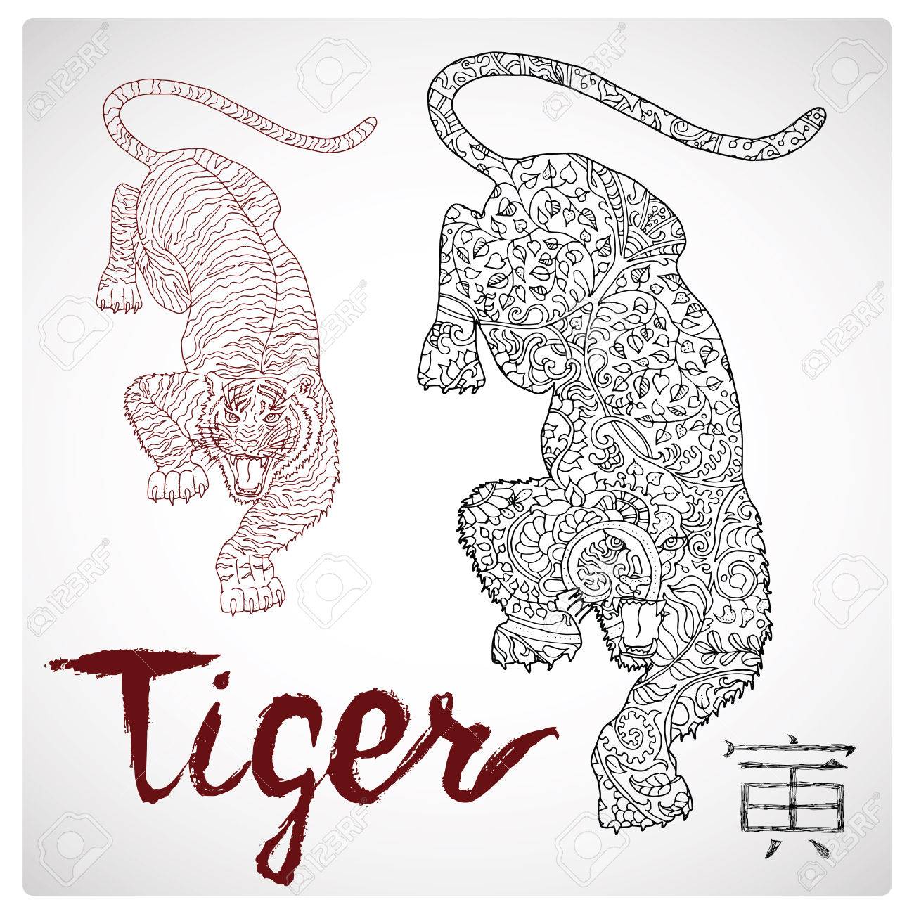 Dibujado A Mano Ilustracion De Tigre Con Estampado De Flores Del Zen Y Las Letras Signo Del Zodiaco Animal Horoscopo Y El Simbolo Astrologico Del Vector Dibujo Grafico De Libro Para Colorear