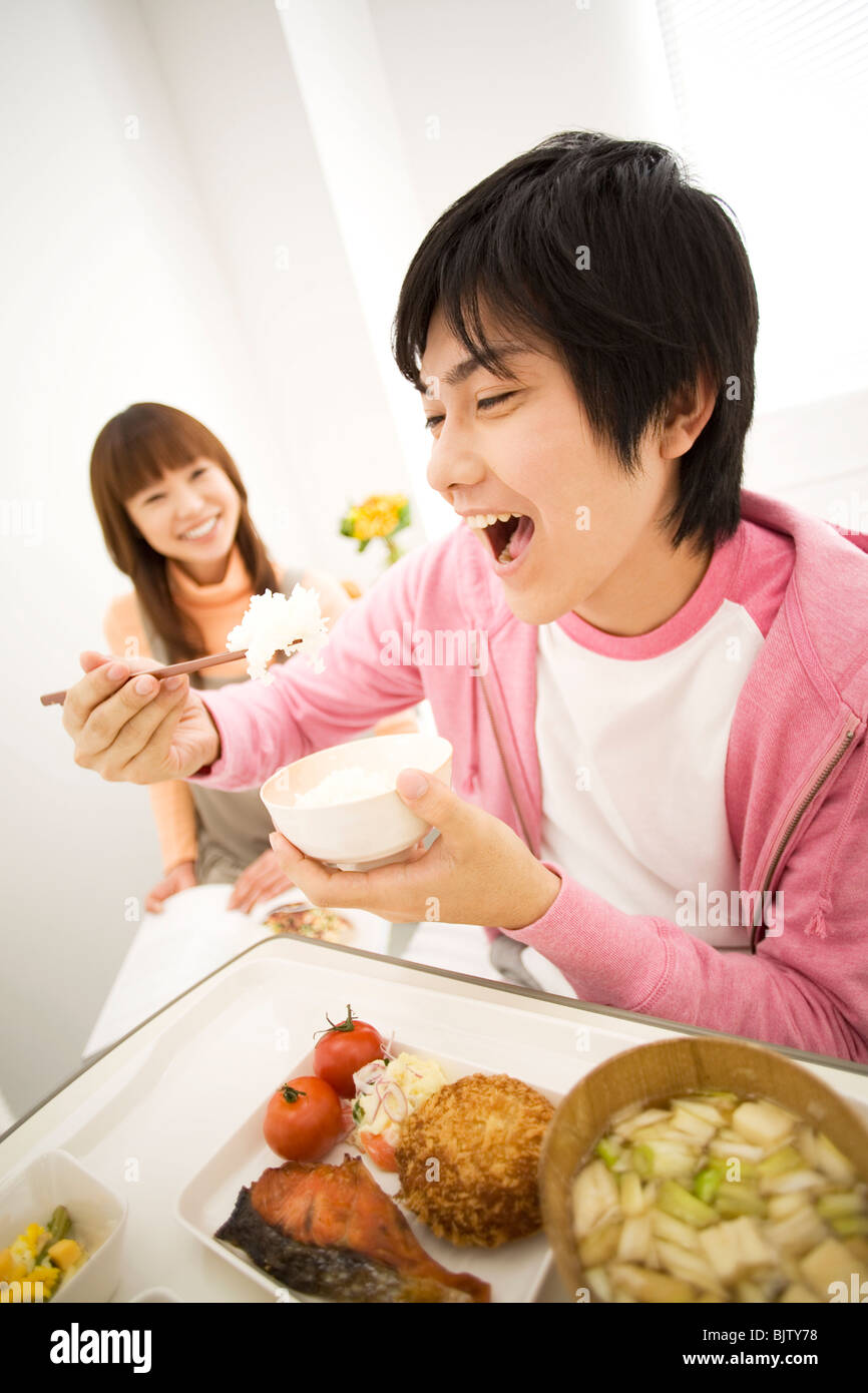 Hombre Comiendo Arroz Y Pimientos Con Palillos Foto De Stock
