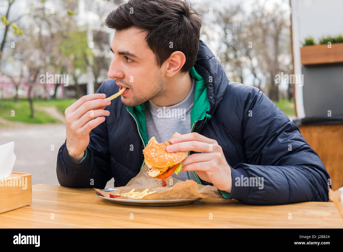 Hombre Comiendo Papas Fritas Con Una Hamburguesa En La Comida De La Calle Cafe Fotografia De Stock Alamy