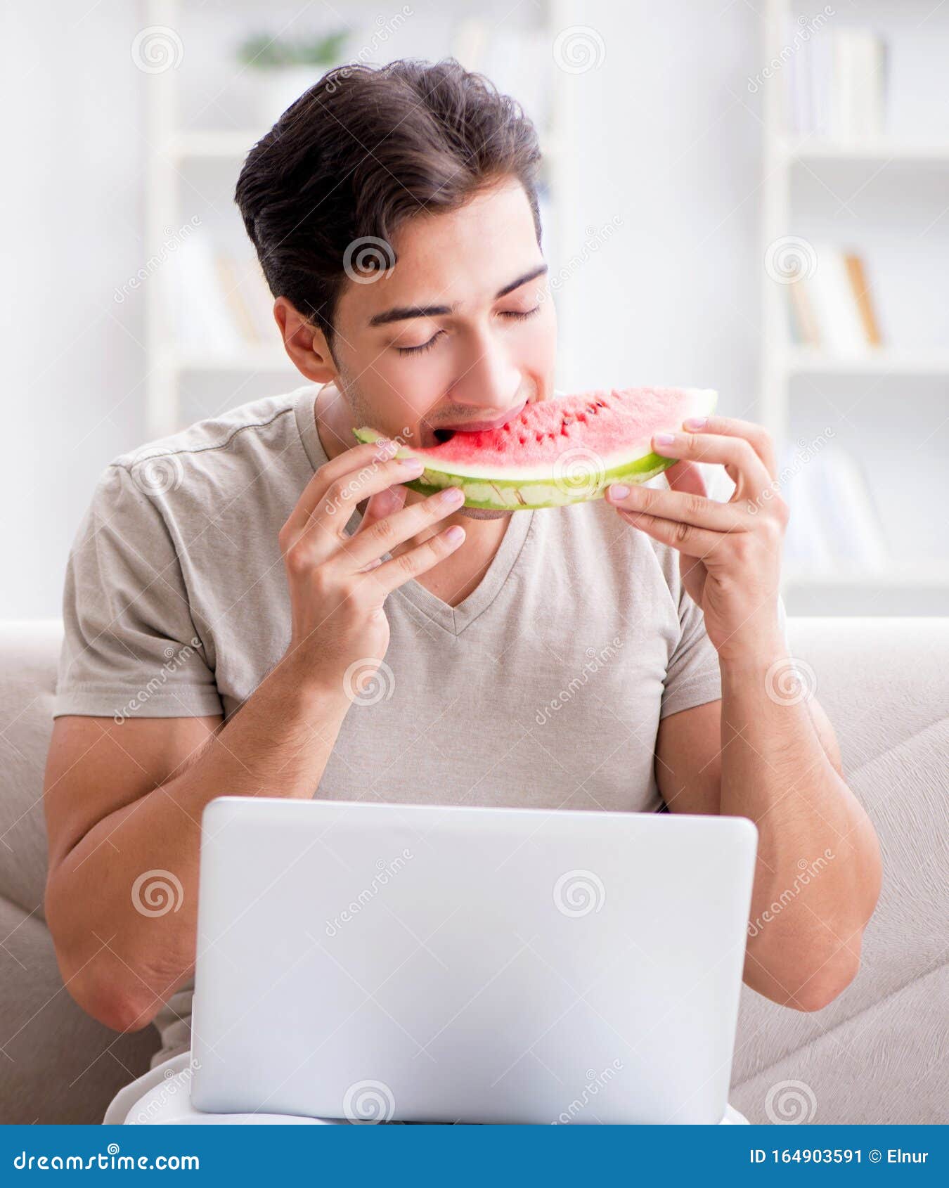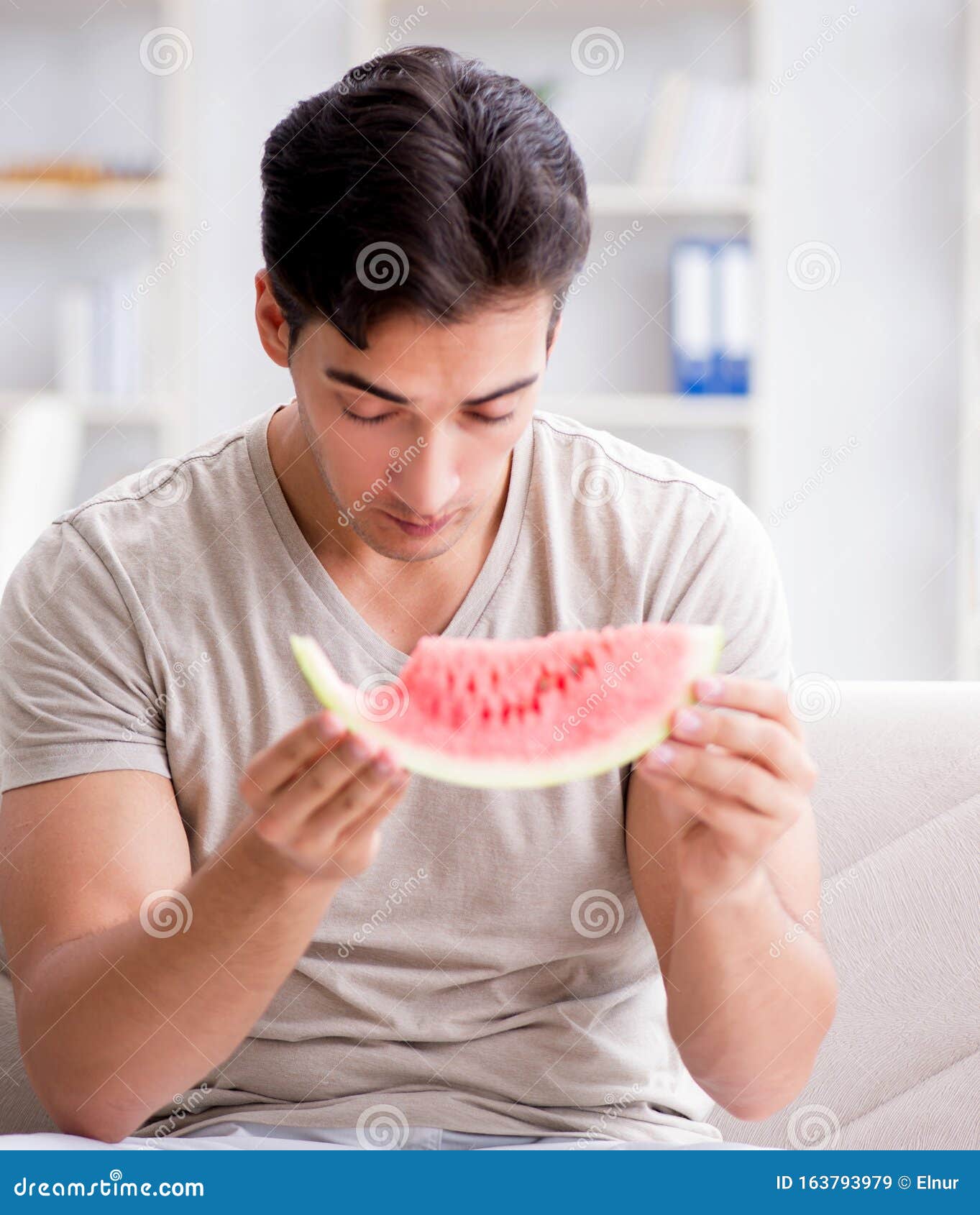 Hombre Comiendo Sandia En Casa Imagen De Archivo Imagen De Casa Comiendo 163793979
