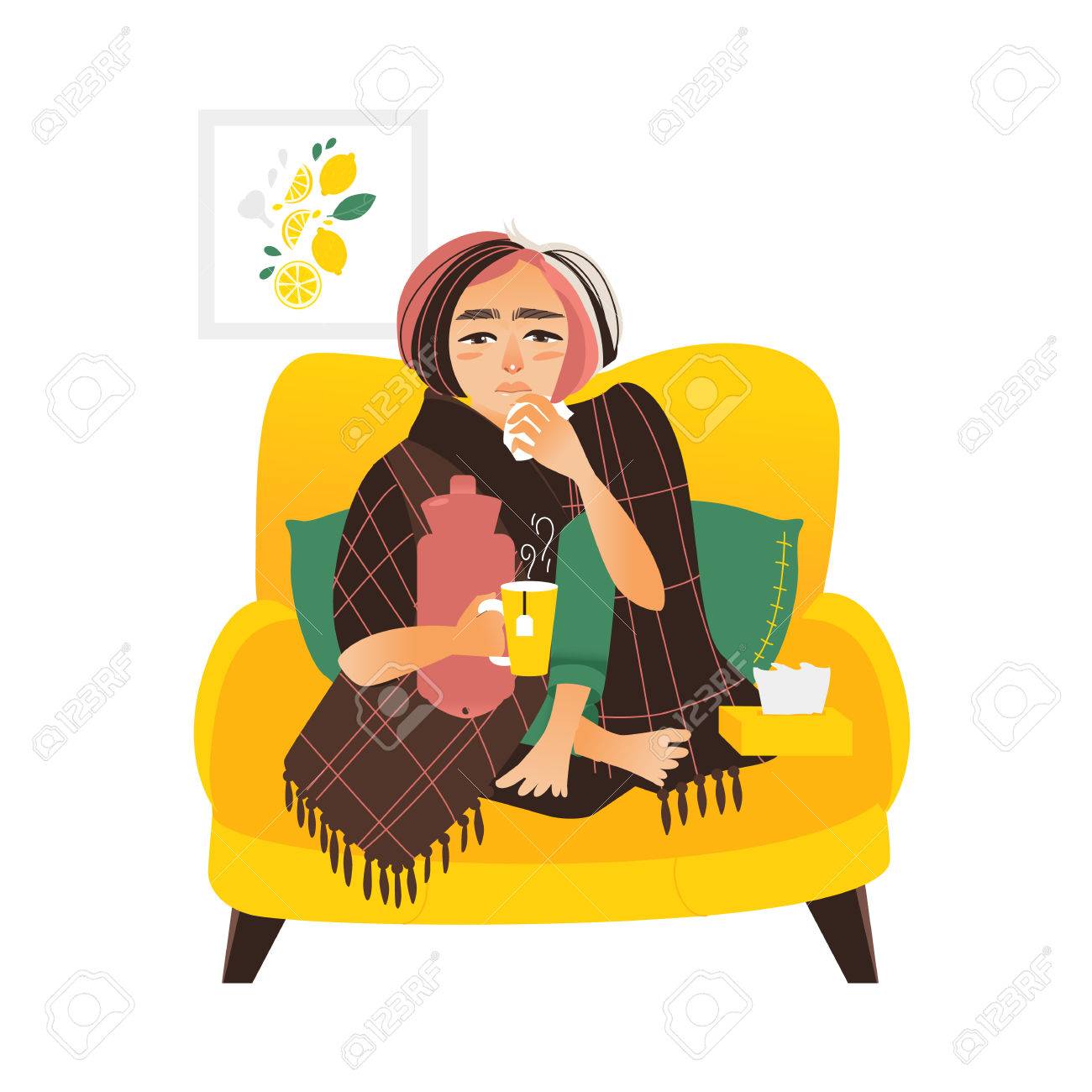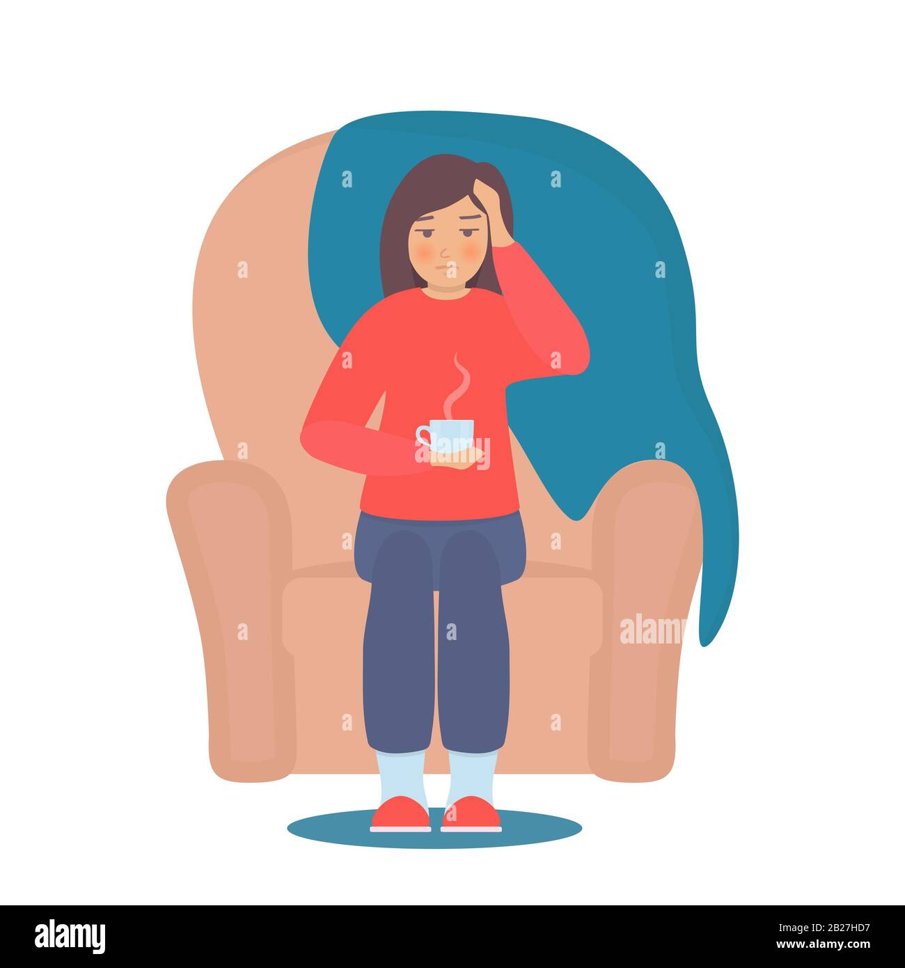 Mujer Enferma Sentada En Una Silla Con Una Taza De Bebida Caliente Caracter Femenino Enfermo De Gripe Estacional Epidemica Enfermedad Enfermedad Enfermedad Vector Concepto Illus Imagen Vector De Stock Alamy