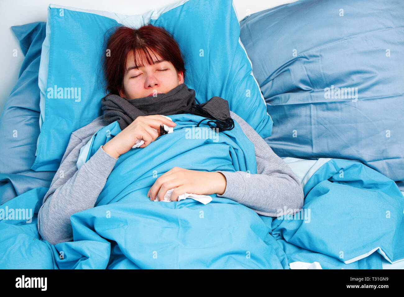 Foto De Mujer Enferma En La Bufanda Acostado En La Cama Fotografia De Stock Alamy