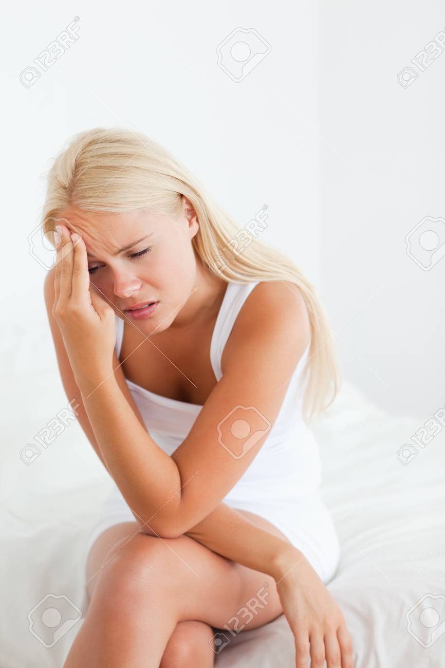 Mujer Enferma En La Cama Tocandose La Cabeza Fotos Retratos Imagenes Y Fotografia De Archivo Libres De Derecho Image 19359559
