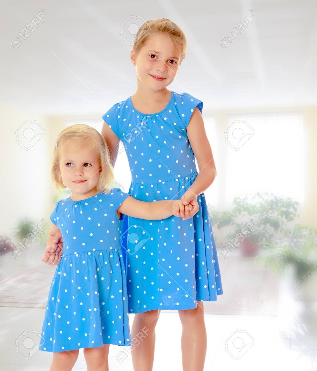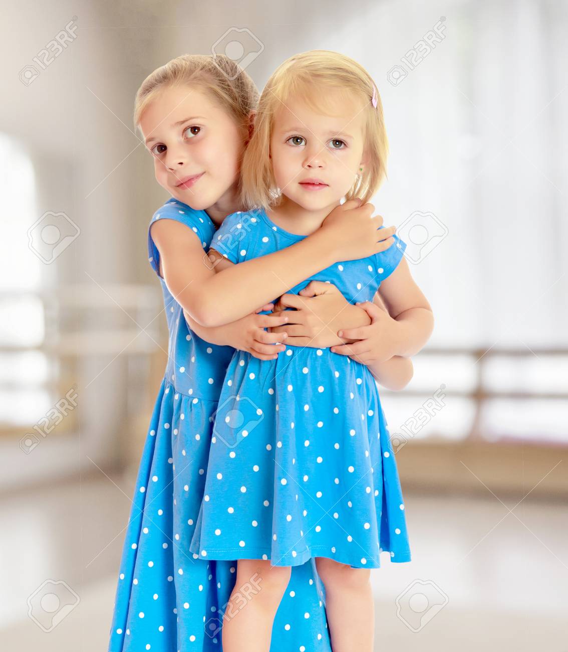 Dos Encantadoras Ninas Hermanas Con Identicos Vestidos Azules Con Lunares Abrazados Fotos Retratos Imagenes Y Fotografia De Archivo Libres De Derecho Image 65686093