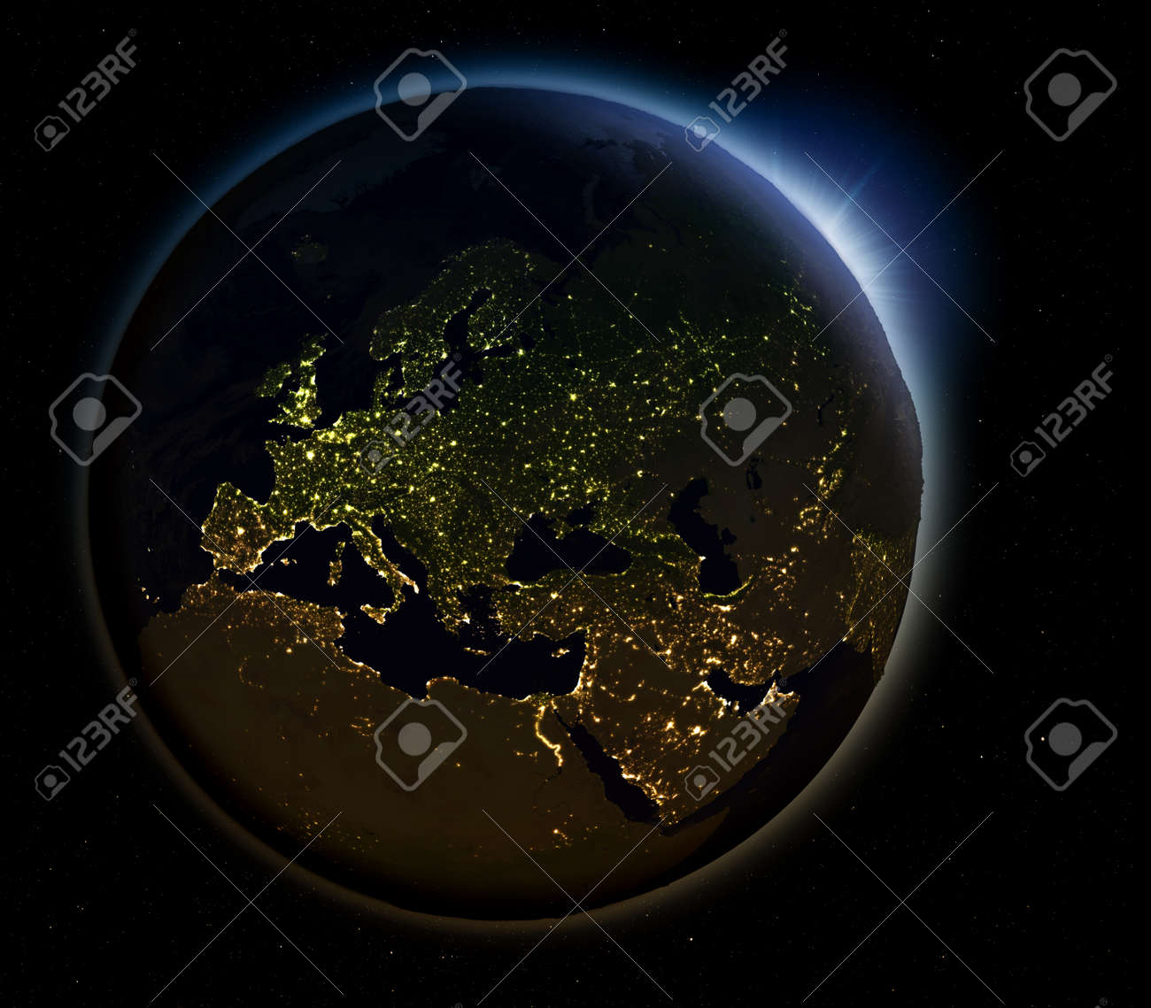 Sol Que Se Levanta Sobre Europa En El Planeta Tierra Visto Desde El Espacio Ilustracion 3d Con Luces Reales De La Ciudad Iluminando La Superficie Fotos Retratos Imagenes Y Fotografia De Archivo