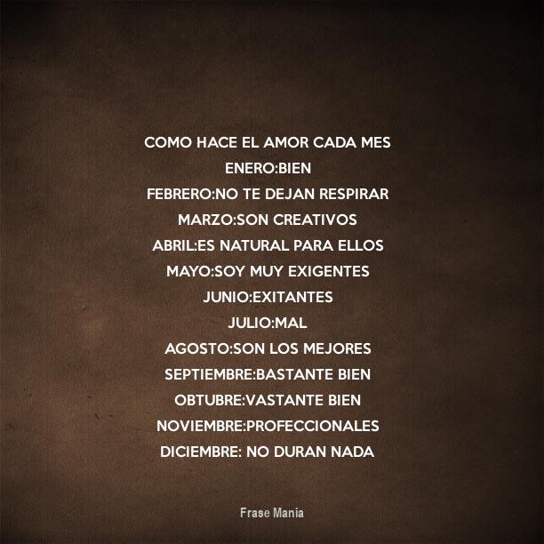 Cartel Para Como Hace El Amor Cada Mes Enero Bien Febrero No Te Dejan Respirar Marzo Son Creativos Abril Es Natural Para Ellos Mayo Soy Muy Exigentes Junio Exitantes Julio Mal Agosto Son Los Mejores Septiembre Bastante Bien Obtubre Vastante Bien
